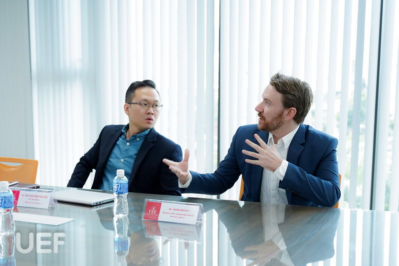 Đại diện UEF còn thông tin thêm cho ông Brian Cao những hoạt động sinh viên sôi nổi diễn ra đều đặn mỗi năm học, chương trình đào tạo chính quy, chương trình liên kết quốc tế, song bằng, song ngành,... Trong đó nhấn mạnh các hoạt động quốc tế nổi bật đã và đang được triển khai như: thực tập quốc tế, học kỳ quốc tế, giao lưu sinh viên quốc tế, sinh viên tham dự các cuộc thi ở nhiều quốc gia,... Ngoài ra, UEF còn giới thiệu hệ thống đối tác toàn cầu và sẵn sàng trở thành cầu nối cho các đơn vị gặp gỡ và liên kết hợp tác với nhau.