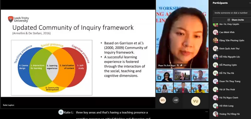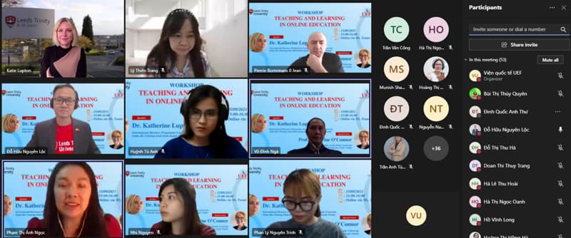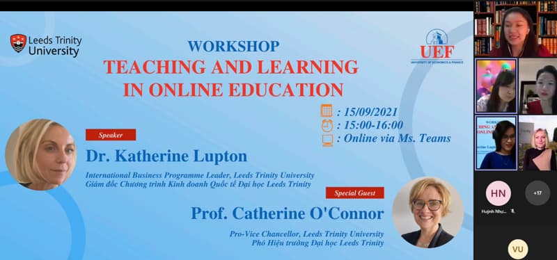 Diễn giả trong chương trình là TS. Katherine Lupton – Giám đốc chương trình Kinh doanh quốc tế Đại học Leeds Trinity (Anh Quốc). Giáo sư Catherine O'Connor - Phó Hiệu trưởng ngôi trường đại học đối tác này cũng đã có những chia sẻ về ý nghĩa của buổi workshop qua video gửi đến Nhà UEF. Vị Giáo sư nhấn mạnh tầm quan trọng của việc nhất quán nền tảng dạy học online, ở đại học Leeds Trinity, nền tảng được thống nhất là MS Teams; Nhu cầu phát triển cộng đồng qua hình thức online; Sức mạnh của việc chia sẻ kinh nghiệm dạy và học online.