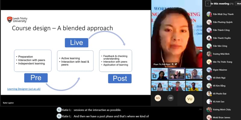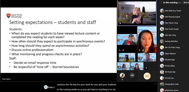 Từ những thuận lợi và khó khăn mà thầy cô đưa ra, TS. Katherine Lupton đã chia sẻ kinh nghiệm giảng dạy, học tập trực tuyến của bản thân: Thiết kế bài giảng theo phương pháp kết hợp trước, trong và sau giờ giảng; Tăng tính tương tác, gắn kết với sinh viên khi học online bằng cách sử dụng một số tính năng như "chat" và chia nhóm nhỏ; Phương pháp đánh giá kết quả học tập sinh viên: chuyển sang hình thức đề mở, chú trọng kiểm tra khả năng hiểu và đánh giá của sinh viên thay vì kiểm tra khả năng ghi nhớ kiến thức của sinh viên như trước đây; Cách sử dụng công nghệ để tăng hiệu quả học tập, đó là khai thác các tính năng của MS Teams như Chat, Giơ tay phát biểu, Breakout rooms,…