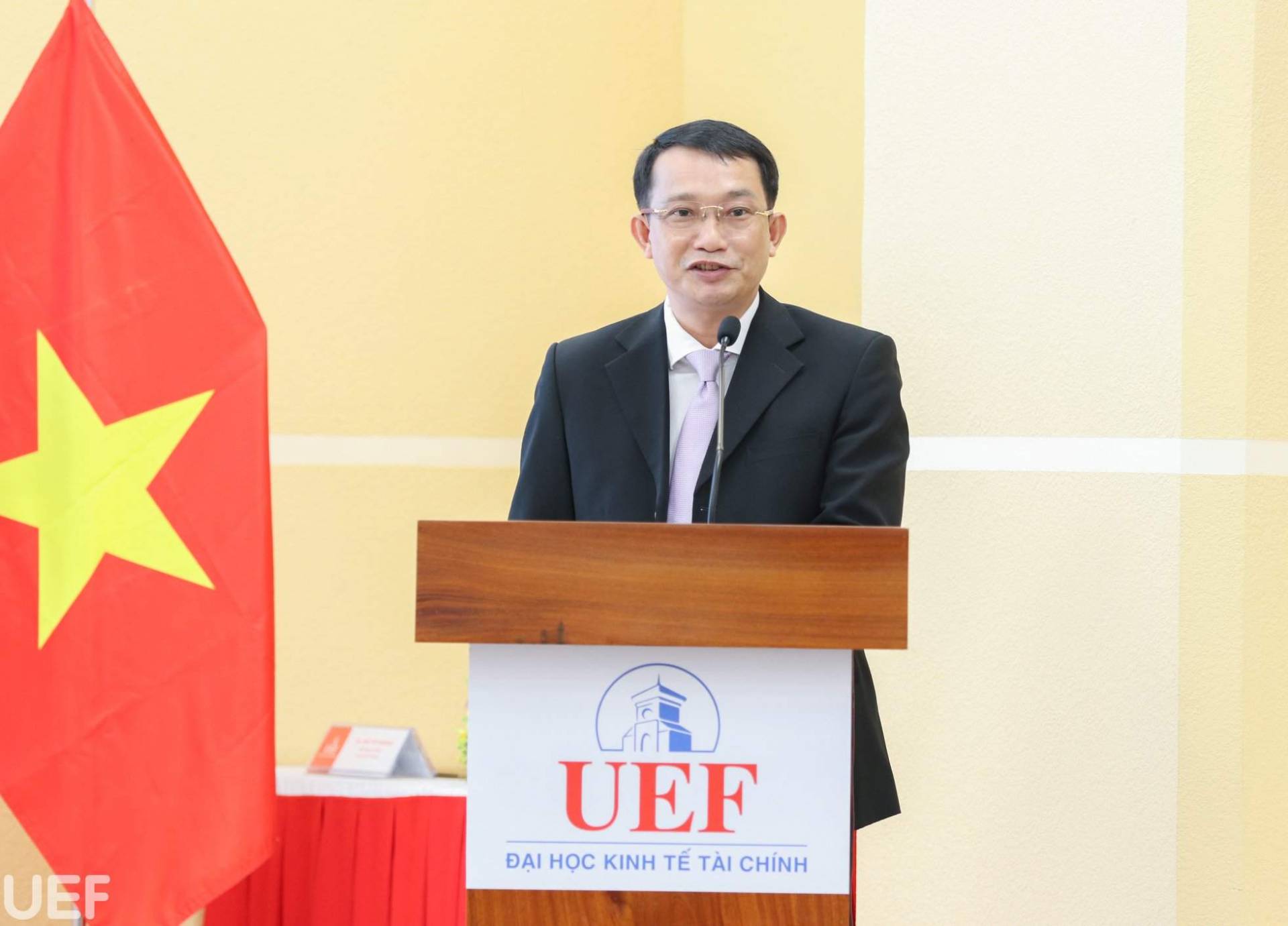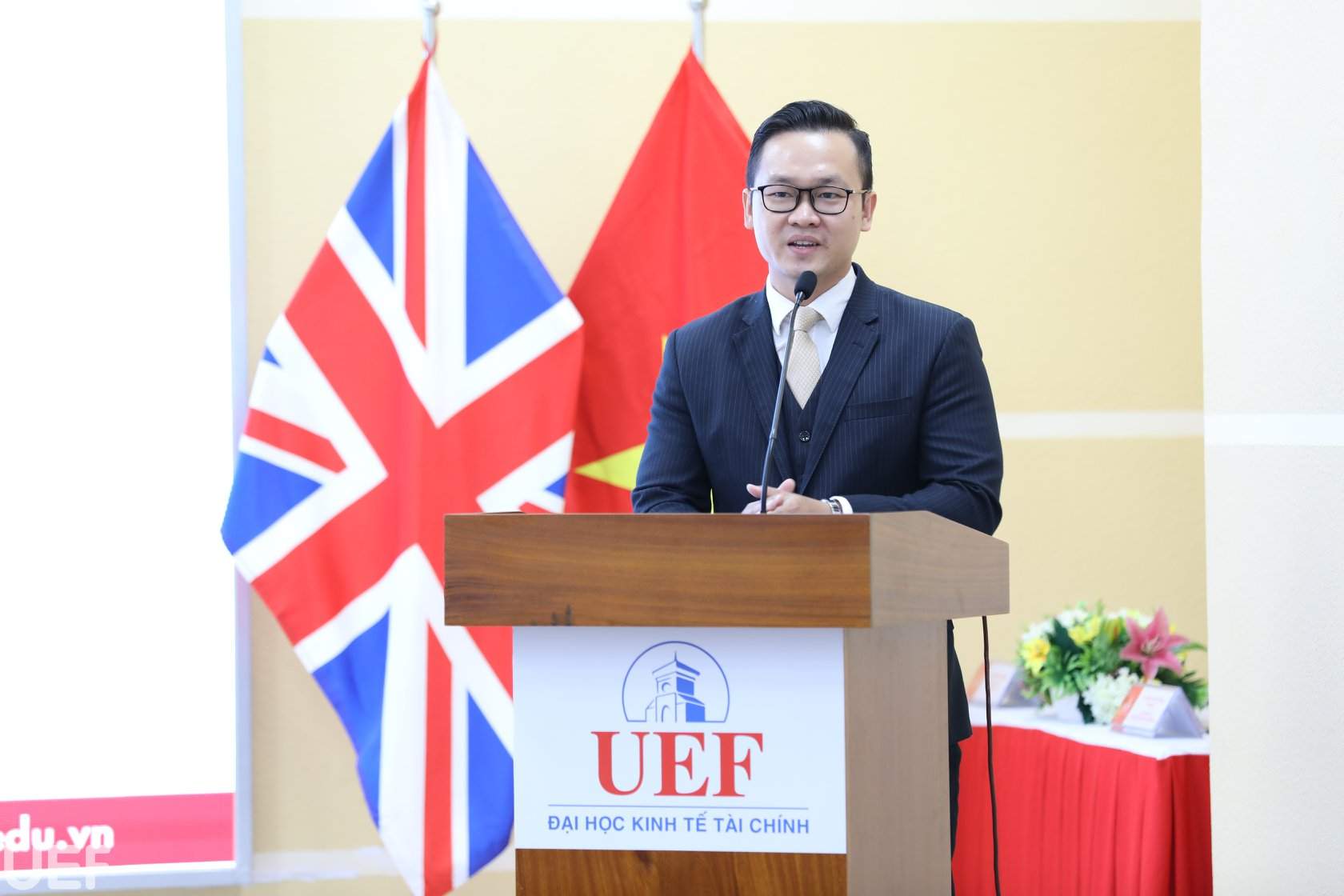 Mở đầu buổi lễ, TS. Đỗ Hữu Nguyên Lộc - Phó Hiệu trưởng Nhà trường - Viện trưởng Viện quốc tế chia sẻ và gửi lời chúc đến các thành viên mới của Viện: “Chúc mừng các bạn tân sinh viên đến từ khắp mọi miền đất nước, vượt qua kỳ thi đại học “cam go” để ngồi đây, tìm hiểu và theo học chương trình giáo dục quốc tế từ Anh Quốc. Nền giáo dục Anh Quốc là một trong những nền giáo dục nổi tiếng nhất trên thế giới, là mối quan tâm của những học sinh có ý định du học. Có đến 500,000 học sinh quốc tế đăng kí mỗi năm, tuy nhiên không phải tất cả học sinh Việt Nam đều có thể giành được tấm vé du học. Đó là lý do tại sao chúng tôi giới thiệu chương trình này tại UEF, để có thể giúp được nhiều sinh viên có được tấm vé du học với nhiều ngành học đa dạng. Chúng tôi cung cấp nhiều giải pháp, nhiều sự lựa chọn để giúp quý phụ huynh học sinh, sinh viên - những người đang tìm kiếm những lựa chọn du học phù hợp nhất với mình.”