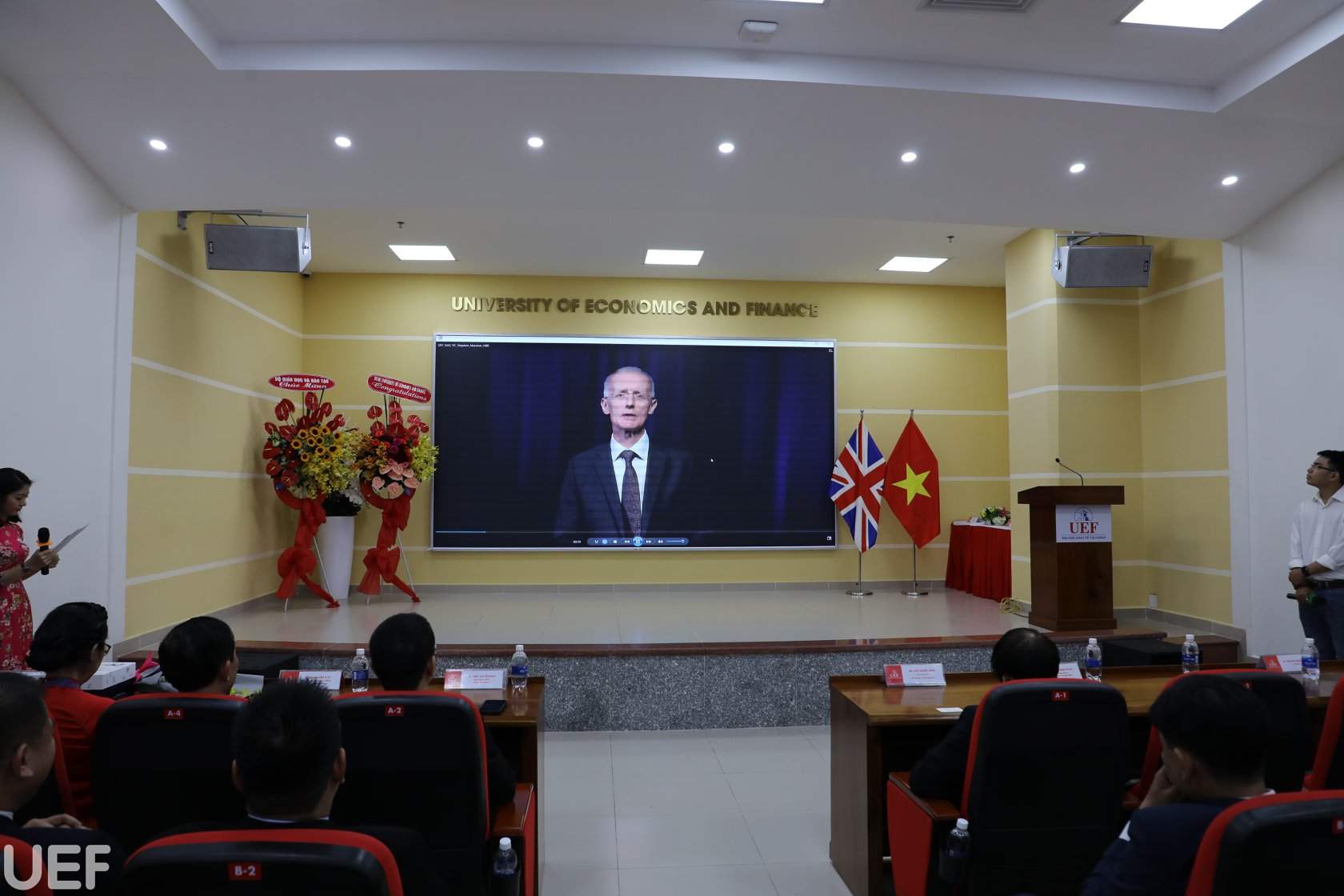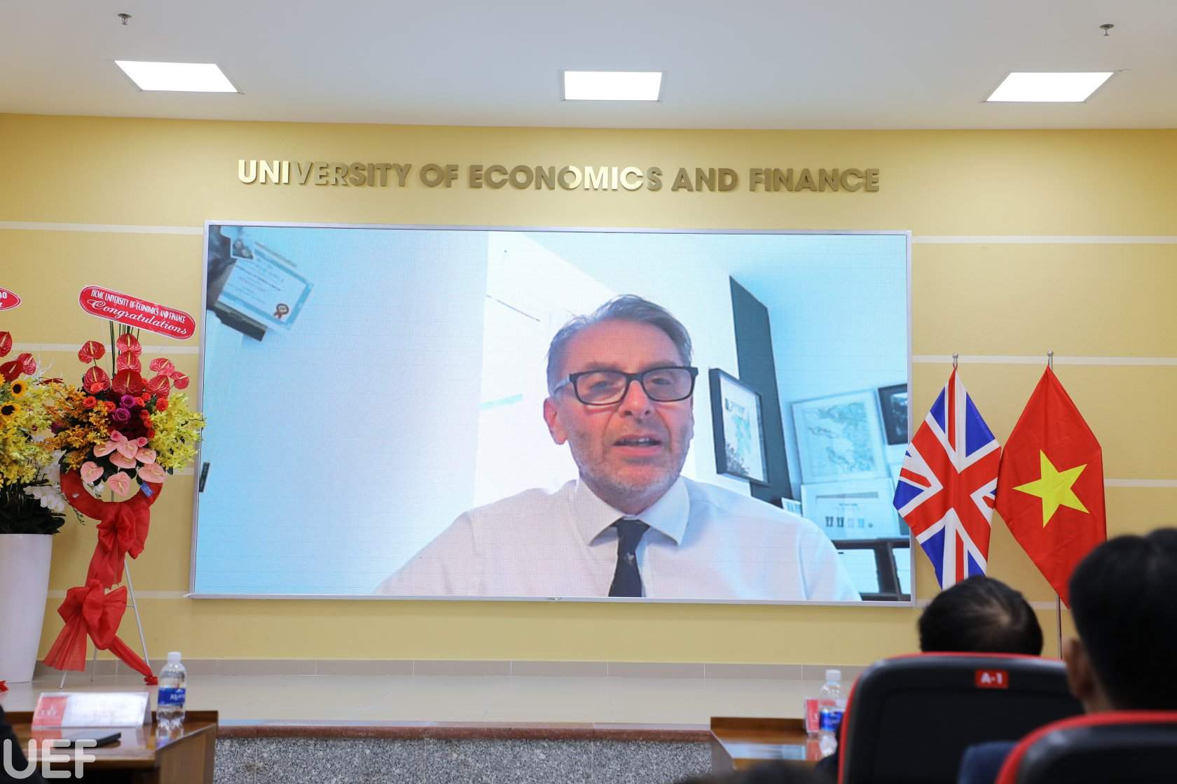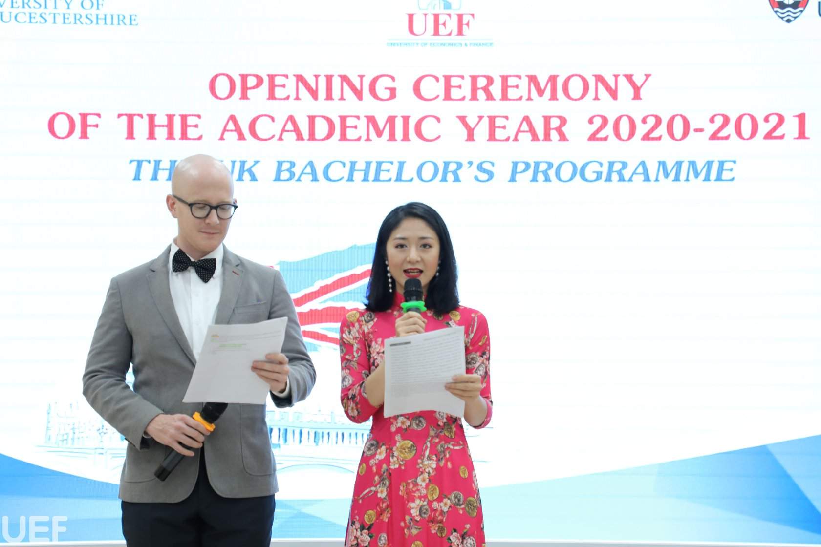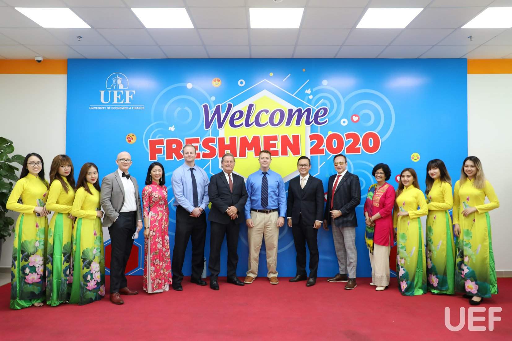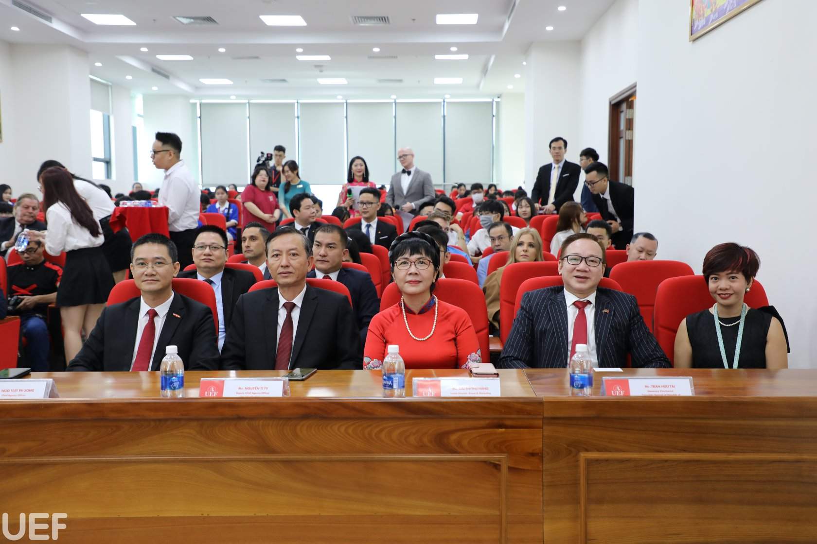 Về phía UEF có ông Đỗ Quốc Anh - Phó Chủ tịch Hội đồng trường, TS. Nguyễn Thanh Giang - Hiệu trưởng Nhà trường, PGS.TS. Ngô Cao Cường - Phó Hiệu trưởng Nhà trường, TS. Đỗ Hữu Nguyên Lộc - Phó Hiệu trưởng Nhà trường - Viện trưởng Viện quốc tế, cùng các thầy cô là giảng viên Viện quốc tế và các bạn tân sinh viên khóa 2020 của chương trình cử nhân Gloucestershire và Leeds Trinity.