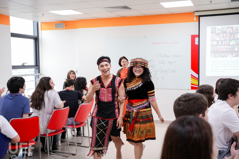 Là “mái nhà” của 54 dân tộc anh em với các vùng miền mang điều kiện tự nhiên và tài nguyên thiên nhiên khác nhau, Việt Nam tạo hứng thú với sinh viên quốc tế bởi sự đa dạng và độc đáo thông qua phần giới thiệu của cô Hồng Hà. Để giúp các bạn hình dung rõ ràng hơn về đặc trưng của các vùng đất như Bắc Bộ, Trung Bộ, Nam Bộ, Tây Nguyên, sinh viên UEF đã cho Pitters chiêm ngưỡng những bộ trang phục dân tộc gắn với đặc trưng của từng vùng đất như áo bà ba, nón lá, áo dài, áo tứ thân, nón quai thao,…