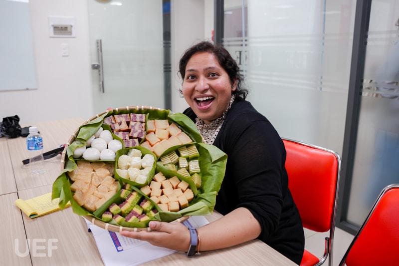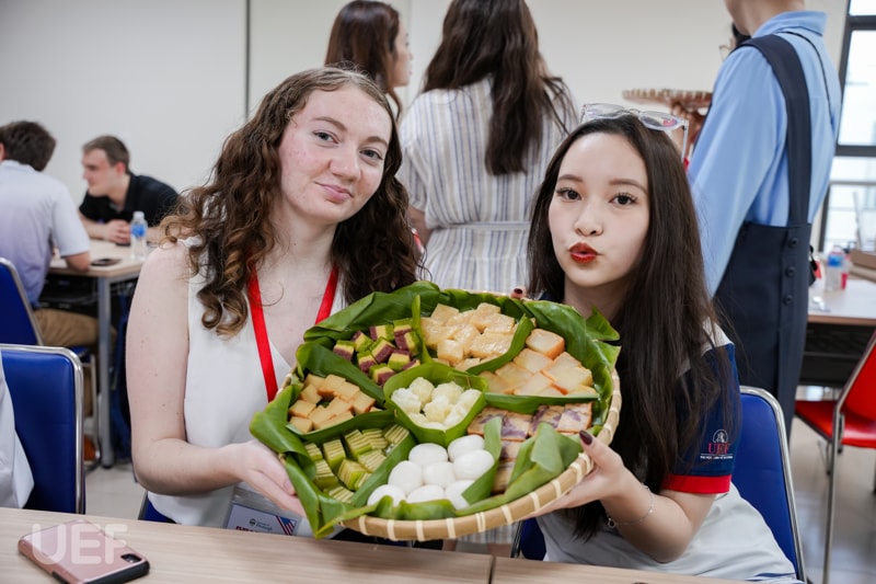 Thưởng thức từng chiếc bánh với đầy đủ màu sắc và hương vị, đoàn sinh viên quốc tế tỏ ra phấn khích trước “mỹ vị nhân gian” của vùng đất Nam Bộ. Điều này giúp các bạn tích lũy thêm trải nghiệm đặc sắc trước khi đặt chân đến tham quan tại vùng sông nước Cửu Long vào tuần sau. Ngoài ra, những món ăn Việt Nam nổi tiếng không thể thiếu như phở, bánh mì và ẩm thực cung đình mang đậm phong cách hoàng gia, dấu ấn của vùng đất nghìn năm văn hiến cũng được giới thiệu đến đoàn sinh viên quốc tế. Thêm vào đó, âm nhạc Việt Nam cũng vô cùng đa dạng và biến hóa. Cô Hồng Hà đã giúp các bạn cảm nhận điều này thông qua video clip về nhạc cụ và âm nhạc dân tộc.