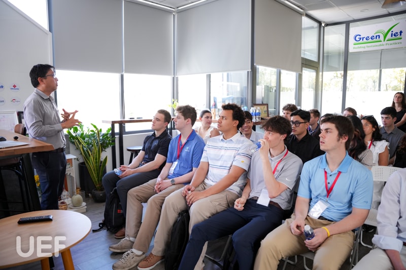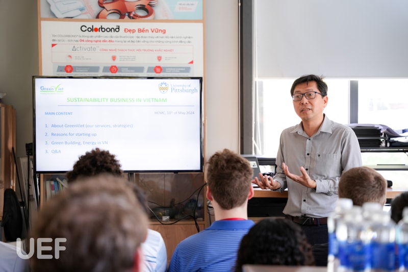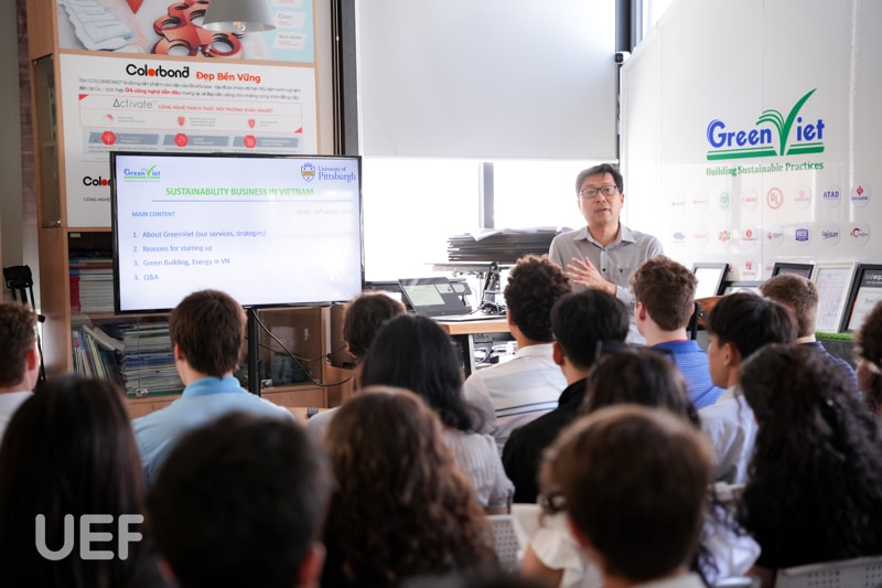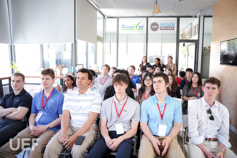 Những ngày qua, đoàn sinh viên Đại học Pittsburgh (Hoa Kỳ) đã được học tập những kiến thức liên quan đến kinh tế, năng lượng và chuyển đổi xanh tại Việt Nam. Để làm dày trải nghiệm thực tế cho các bạn, UEF đã tổ chức buổi tham quan tại GreenViet vào sáng 10/5. Đây là một trong những nhà tư vấn công trình xanh đầu tiên tại Việt Nam, tập trung vào xây dựng bền vững và công trình xanh.