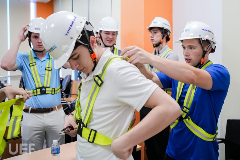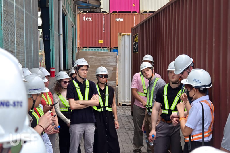 Trước khi vào cảng tham quan, các bạn được trang bị nón và dây bảo hộ để đảm bảo an toàn. Đại diện công ty đã hướng dẫn và chia sẻ với các bạn cách vận hành ở từng khu vực. Môi trường thực tế trong cảng càng làm cho sinh viên quốc tế có thêm góc nhìn mới mẻ.