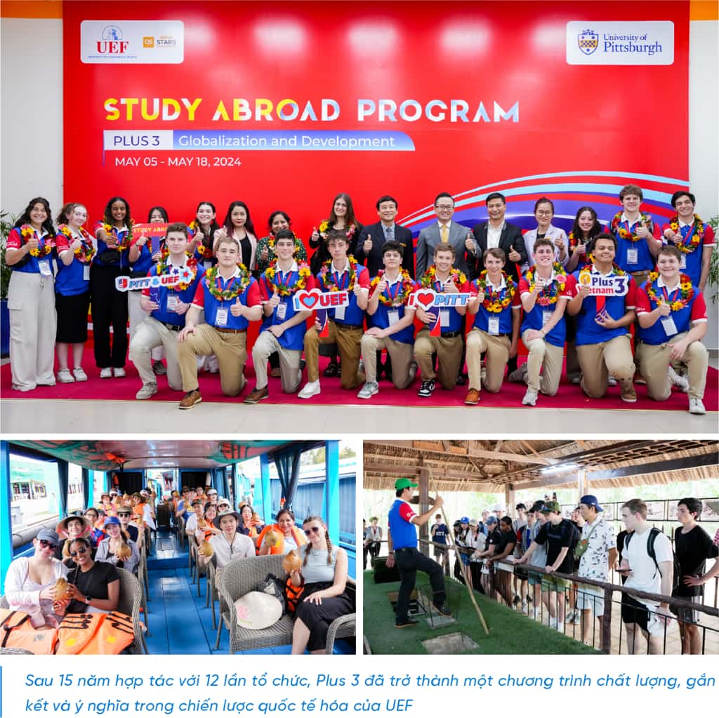 Năm 2024, chương trình học kỳ quốc tế Plus 3 do Đại học Pittsburgh tổ chức với quy mô toàn cầu trải rộng trên 7 quốc gia gồm: Hàn Quốc, Argentina, Hà Lan, Ecuador, Việt Nam, Costa Rica, Cyprus (Cộng hòa Síp). Tại Việt Nam, UEF là trường đại học duy nhất mà sinh viên Pittsburgh lựa chọn học tập trải nghiệm, đây cũng là đại diện duy nhất ở khu vực Đông Nam Á của chương trình.