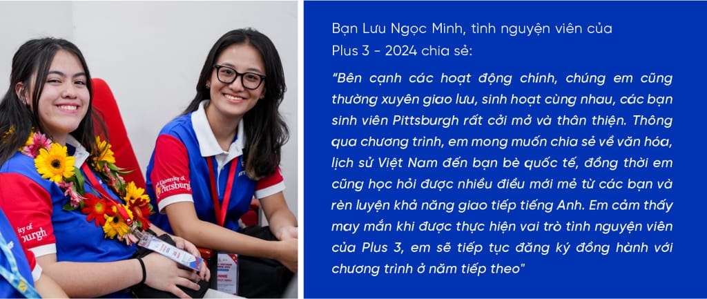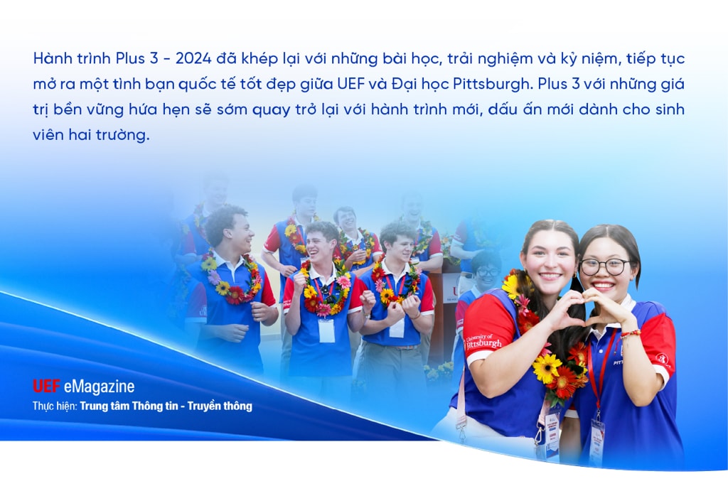 Với sự trở lại trong năm 2024, chương trình học kỳ quốc tế Plus 3 do Trường Đại học Pittsburgh - Hoa Kỳ (Pitt) phối hợp với UEF tổ chức đã mang đến nhiều dấu ấn nổi bật ở “tuổi” 12. Trải qua chặng đường 2 tuần, sinh viên UEF và sinh viên Pitt có nhiều trải nghiệm cùng nhau, học tập ngôn ngữ, tìm hiểu về văn hóa, lịch sử, kiến thức về kinh tế Việt Nam. Qua đó, nhiều câu chuyện đẹp đã được viết nên và lưu giữ.