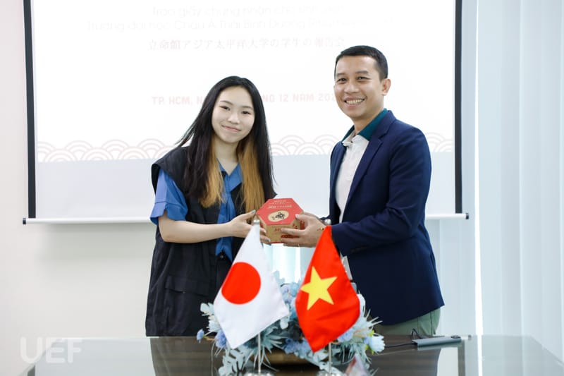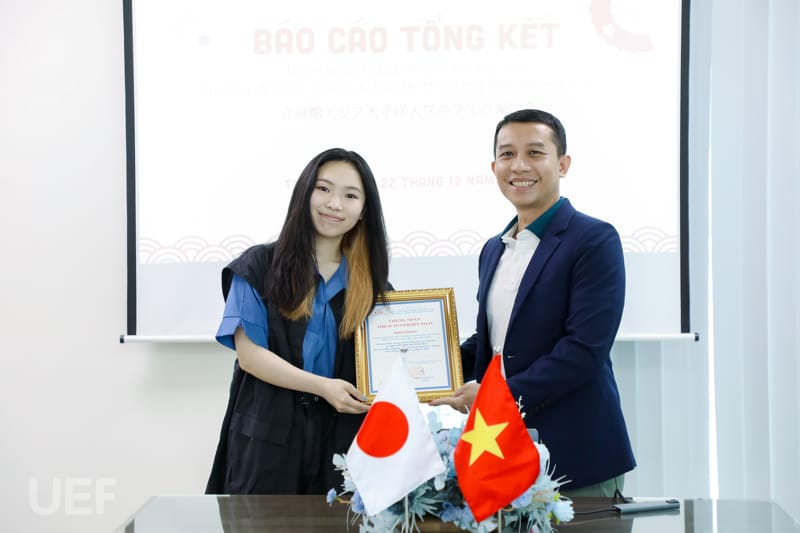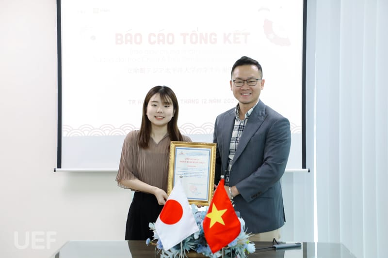 Sau khi trao giấy chứng nhận, TS. Đỗ Hữu Nguyên Lộc đã chia sẻ và gửi lời chúc mừng, cũng như lời chào tạm biệt đến hai bạn sinh viên Nhật Bản. Thầy cũng bày tỏ rằng các bạn đã có thời gian trải nghiệm và có nhiều kỷ niệm đáng nhớ tại UEF.