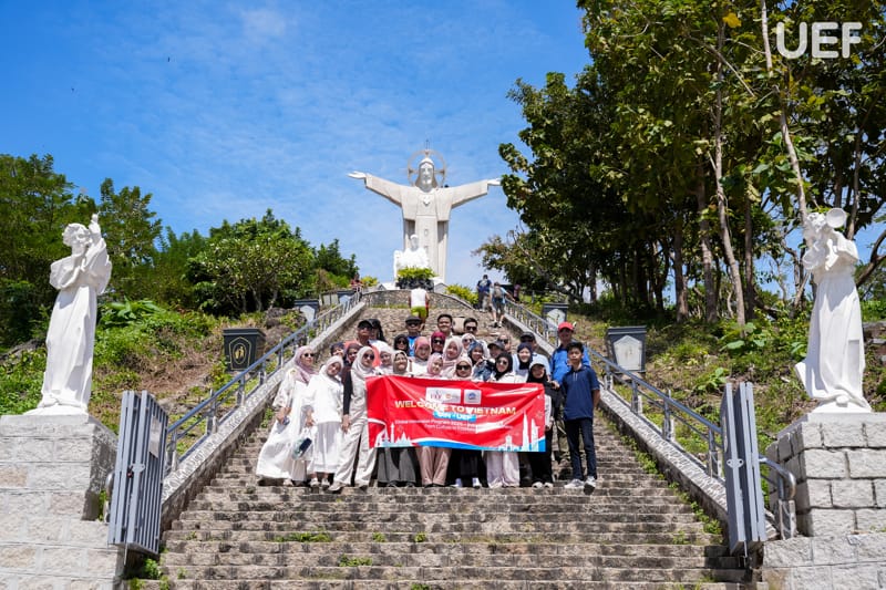 Khởi hành từ TP.HCM, đoàn đặt chân đến điểm dừng đầu tiên là tượng Chúa Kitô Vua trên Núi Nhỏ. Tại đây, sinh viên UIN đã leo lên các bậc thang quanh tượng để ngắm toàn cảnh thành phố từ trên cao, tìm hiểu về lịch sử và văn hóa của một trong những biểu tượng nổi bật của Vũng Tàu.