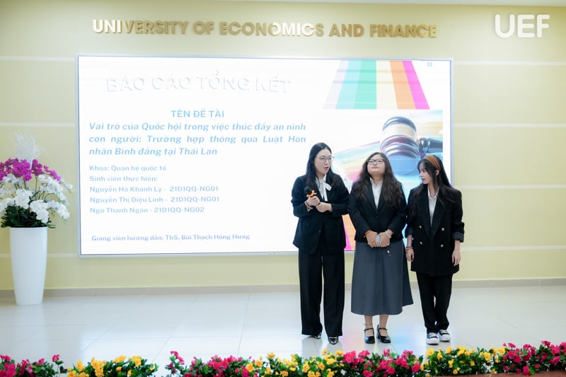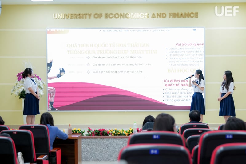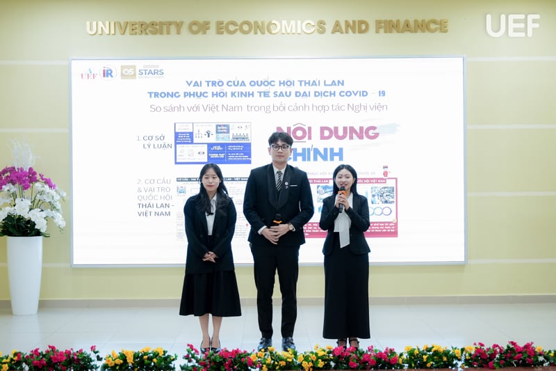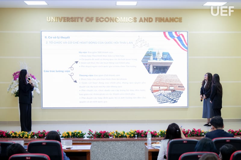 Tại buổi tổng kết, 13 nhóm sinh viên đã trình bày báo cáo thực tập với các đề tài phong phú, phản ánh những vấn đề đang được quan tâm trong lĩnh vực quan hệ quốc tế hiện đại như chuyển giao tri thức, hợp tác giáo dục quốc tế, vai trò của quốc hội trong phục hồi kinh tế và thúc đẩy an ninh con người, chính sách đối ngoại và quyền lực mềm của Thái Lan, cũng như tác động của trí tuệ nhân tạo trong giáo dục và truyền thông quốc tế. Các đề tài cho thấy sự kết nối chặt chẽ giữa lý thuyết và thực tiễn, cũng như tư duy phản biện và khả năng nghiên cứu của sinh viên UEF.
