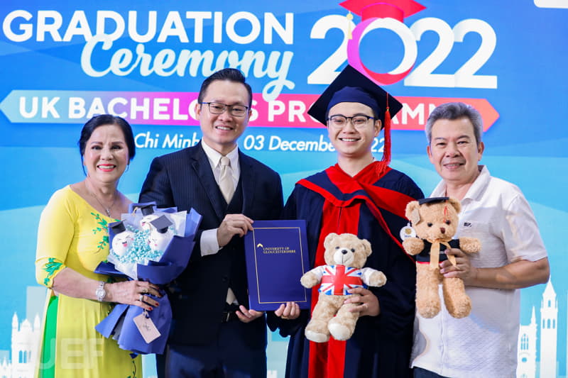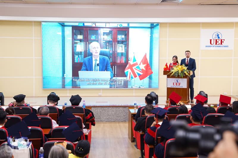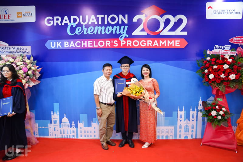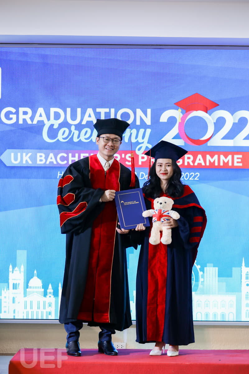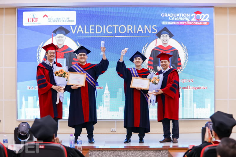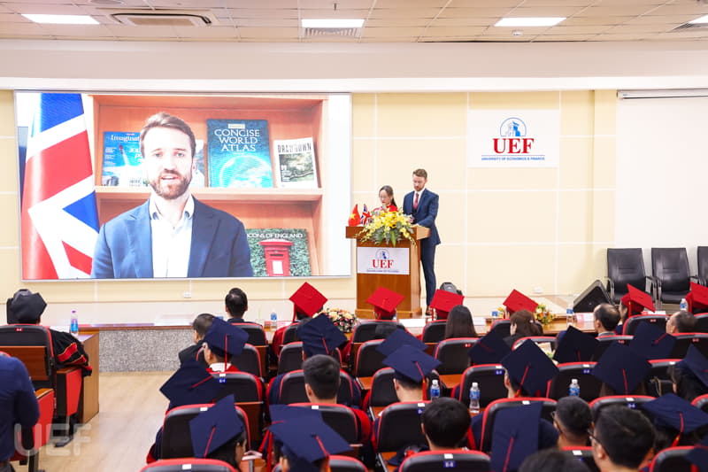 Trong không khí trang trọng, thay mặt Nhà trường và Viện Quốc tế UEF, TS. Đỗ Hữu Nguyên Lộc đã gửi lời chúc mừng đến các tân Cử nhân chương trình Gloucestershire: "Thay mặt Ban Giám hiệu Nhà trường, thầy chúc mừng các bạn đã chính thức tốt nghiệp. Với sự nỗ lực và cố gắng không ngừng nghỉ trong 4 năm học tập, cuối cùng các bạn đã hoàn thành chương trình với tấm bằng cử nhân Anh Quốc trong tay. Lễ tốt nghiệp là một ngày trọng đại, là ngày để chúc mừng cũng là lúc nghĩ về những cơ hội và thử thách đón chờ các bạn trong tương lai. Thầy tin chắc rằng các bạn cử nhân ở đây đã được trang bị đầy đủ kiến thức, kỹ năng cần thiết và sẵn sàng thích nghi với môi trường bên ngoài, tự tin trở thành công dân toàn cầu. Thầy hy vọng tất cả dự định của các bạn trong tương lai đều sẽ trở thành hiện thực. Thầy tự hào về các bạn, gia đình tự hào về các bạn, cộng đồng UEF và UoG tự hào về các bạn".