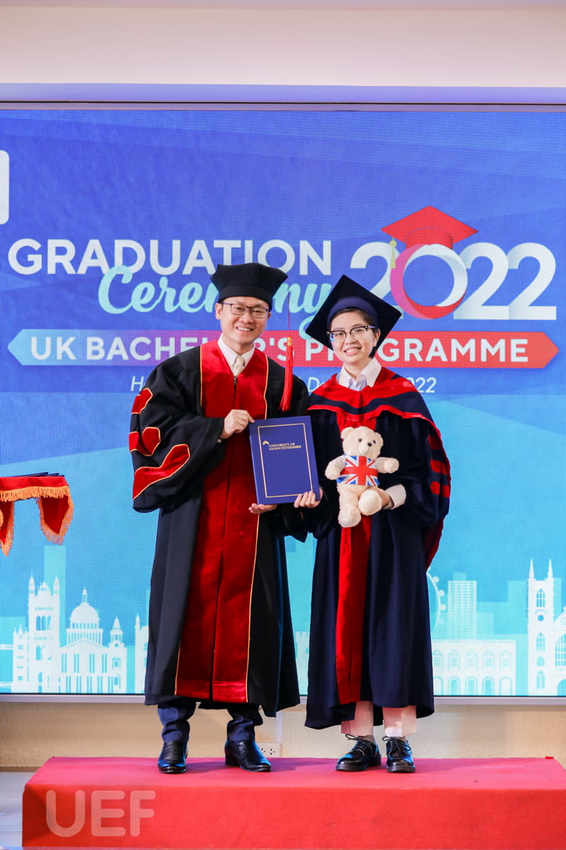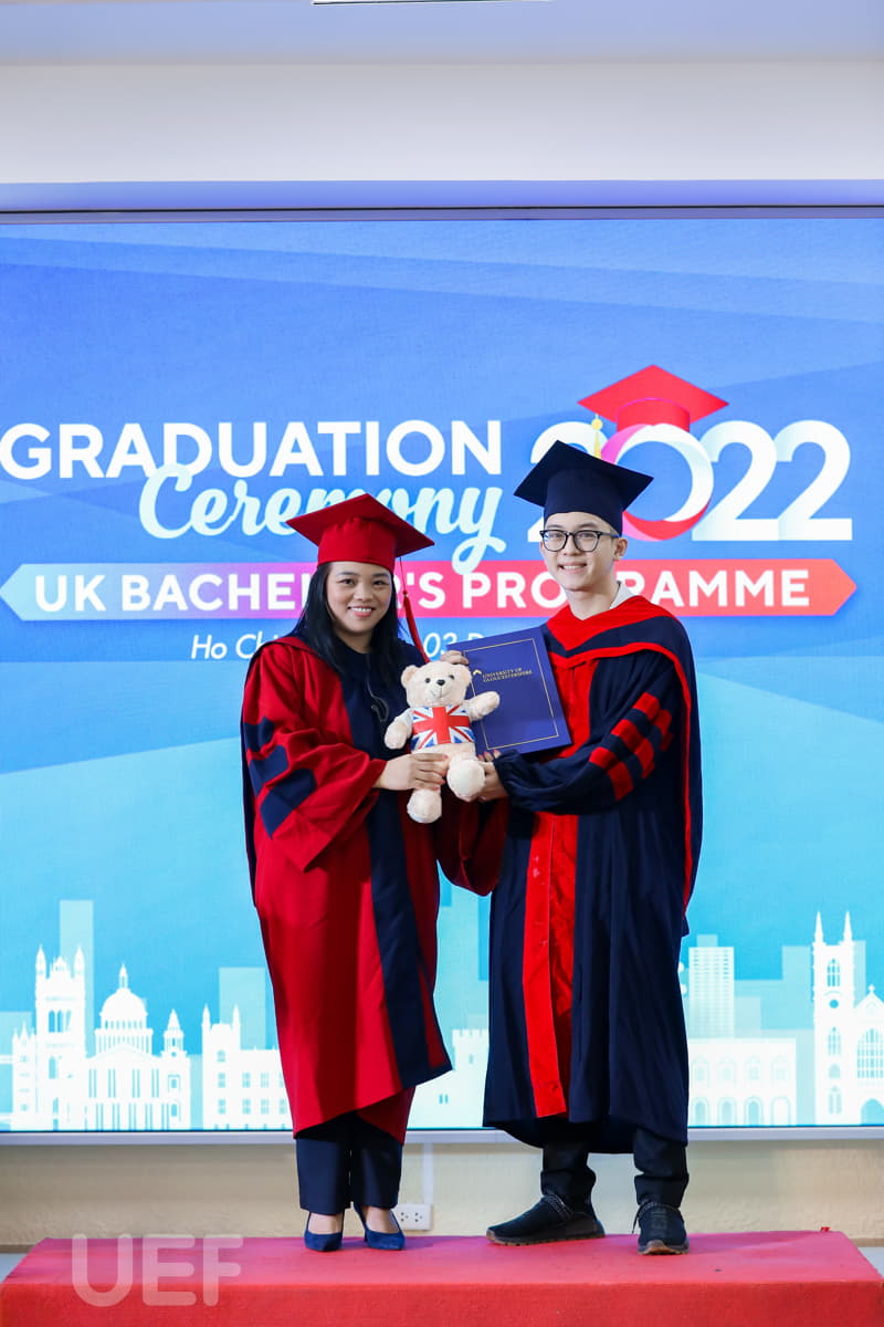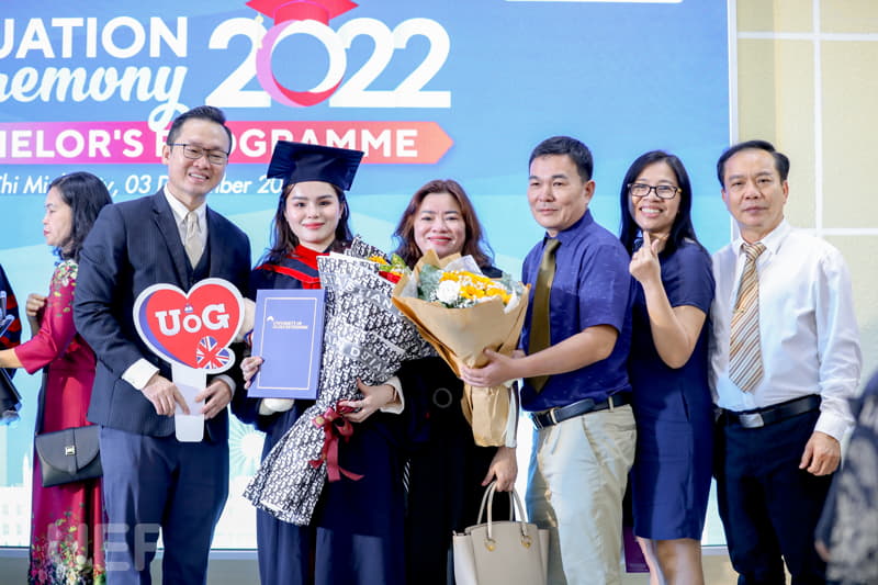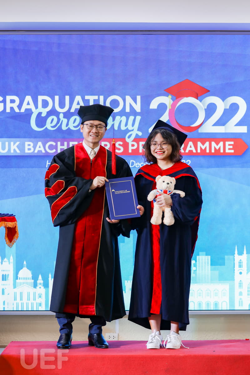 Trong không khí trang trọng, thay mặt Nhà trường và Viện Quốc tế UEF, TS. Đỗ Hữu Nguyên Lộc đã gửi lời chúc mừng đến các tân Cử nhân chương trình Gloucestershire: "Thay mặt Ban Giám hiệu Nhà trường, thầy chúc mừng các bạn đã chính thức tốt nghiệp. Với sự nỗ lực và cố gắng không ngừng nghỉ trong 4 năm học tập, cuối cùng các bạn đã hoàn thành chương trình với tấm bằng cử nhân Anh Quốc trong tay. Lễ tốt nghiệp là một ngày trọng đại, là ngày để chúc mừng cũng là lúc nghĩ về những cơ hội và thử thách đón chờ các bạn trong tương lai. Thầy tin chắc rằng các bạn cử nhân ở đây đã được trang bị đầy đủ kiến thức, kỹ năng cần thiết và sẵn sàng thích nghi với môi trường bên ngoài, tự tin trở thành công dân toàn cầu. Thầy hy vọng tất cả dự định của các bạn trong tương lai đều sẽ trở thành hiện thực. Thầy tự hào về các bạn, gia đình tự hào về các bạn, cộng đồng UEF và UoG tự hào về các bạn".