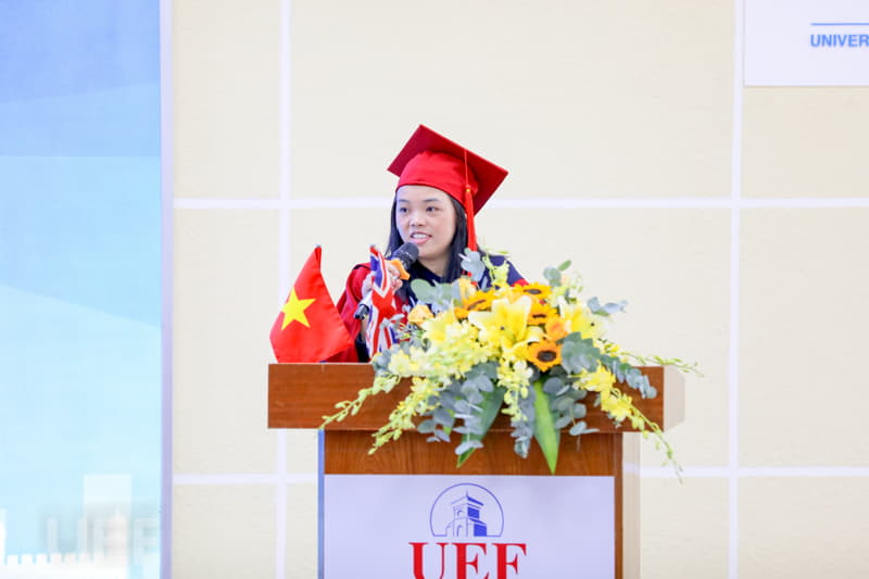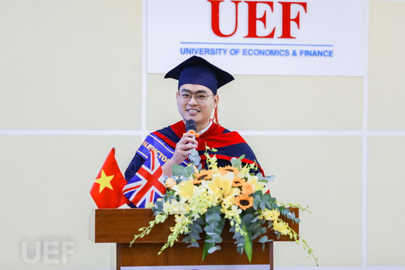 Đại diện sinh viên tốt nghiệp, bạn Lưu Phúc Trường - Tân thủ khoa ngành Quản trị kinh doanh và Marketing phát biểu cảm nhận: "Em muốn bày tỏ sự biết ơn đến gia đình, thầy cô đã ủng hộ, hỗ trợ chúng em trong quá trình học tập. Khi chọn chương trình Cử nhân Gloucestershire tại UEF, em đã nghĩ đây là chương trình chất lượng và cần thiết đối với mình. Sau khi tốt nghiệp, có thể 10 năm về sau, chúng em sẽ không nhớ những kiến thức đã học, nhưng tư duy, kỹ năng, trách nhiệm mà thầy cô đã dạy bảo sẽ còn mãi. Những kỷ niệm cùng bạn bè tại Nhà UEF cũng là sẽ trở thành một phần ký ức đẹp trong em".