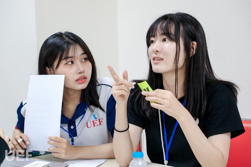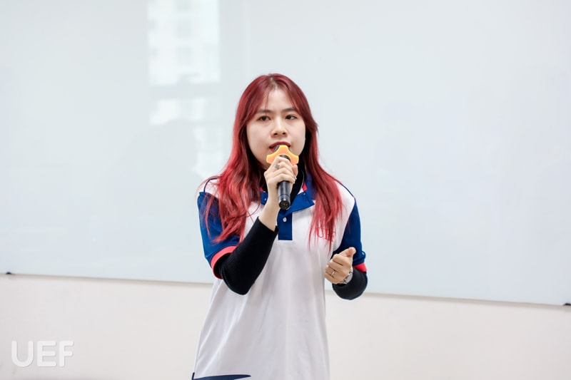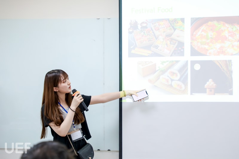 Tiếp đó, sinh viên hai bên đã có phần thuyết trình về đất nước cũng như trường đại học mình đang theo học. UEFers tự tin chia sẻ hoàn toàn bằng tiếng Anh.