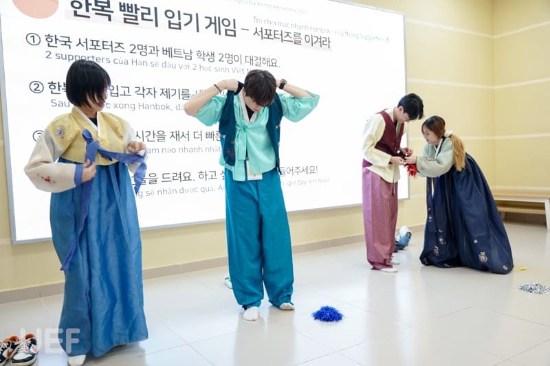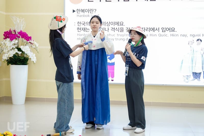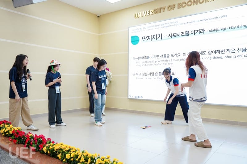 Trong không khí hào hứng, sinh viên hai trường nhanh chóng hòa mình vào các tiết mục giao lưu đặc sắc. Ngoài ra, trong buổi giao lưu, các bạn sinh viên Keimyung đã mang đến một loạt trò chơi đặc sắc, mang đậm chất văn hóa Hallyu - Hàn Quốc. Các hoạt động như nhảy Kpop, nhìn ảnh đoán nhân vật nổi tiếng, trò chơi đập hình (trong phim Squid Game), nhảy theo điệu nhạc và đoán tên bài hát đã tạo nên không khí vui tươi, gần gũi cho sinh viên hai trường. Bên cạnh đó, UEFers đã có dịp mặc thử trang phục truyền thống của Hàn Quốc - Hanbok, các bạn sinh viên Keimyung cũng đã được Nhà UEF gửi tặng những chiếc nón lá xinh xắn.