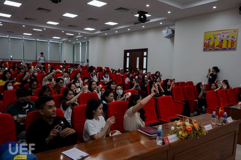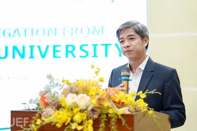 Phát biểu chào mừng đoàn sinh viên, TS. Nguyễn Thanh Giang nhấn mạnh tầm quan trọng của hoạt động giao lưu, trao đổi văn hóa, kết bạn và học hỏi thêm ngôn ngữ giữa hai trường. Điều này giúp các bạn rèn luyện kỹ năng ngôn ngữ và bổ sung kiến thức về văn hóa các nước. Đồng thời, thầy cũng chia sẻ thêm về thông tin chương trình đào tạo và mô hình gắn kết thực tiễn của Nhà UEF.