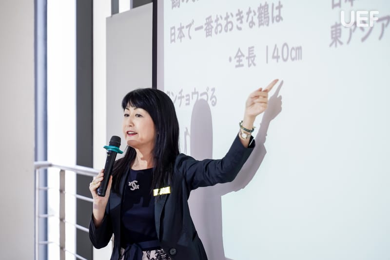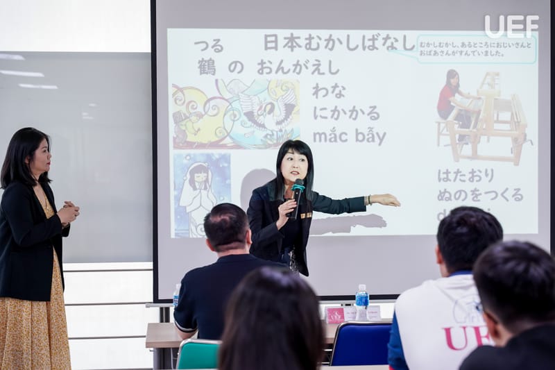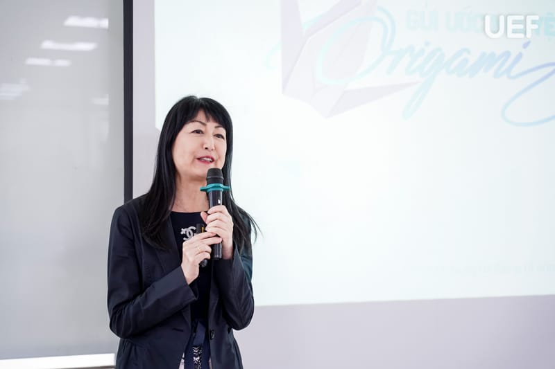 Cô Igeta Miyuki chia sẻ câu chuyện về hạc giấy ở Nhật Bản và hướng dẫn cách gấp hạc cho sinh viên