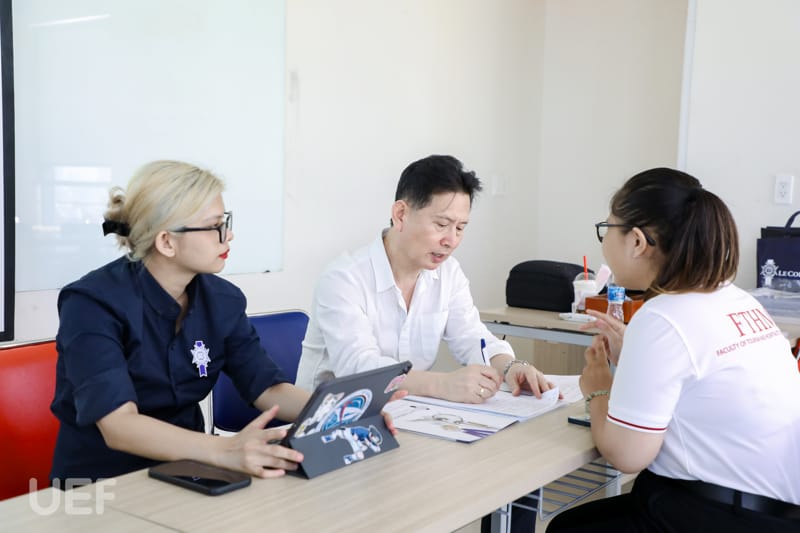 Đại diện Le Cordon Bleu New Zealand phỏng vấn có ông Andrew Lee - Giám đốc Marketing và thành viên của học viện. Về phía Khoa Quản trị du lịch - Khách sạn UEF có ThS. Nguyễn Viết Thủy - Phó Trưởng khoa, ThS. Nguyễn Thị Lan Chi - Giảng viên khoa.