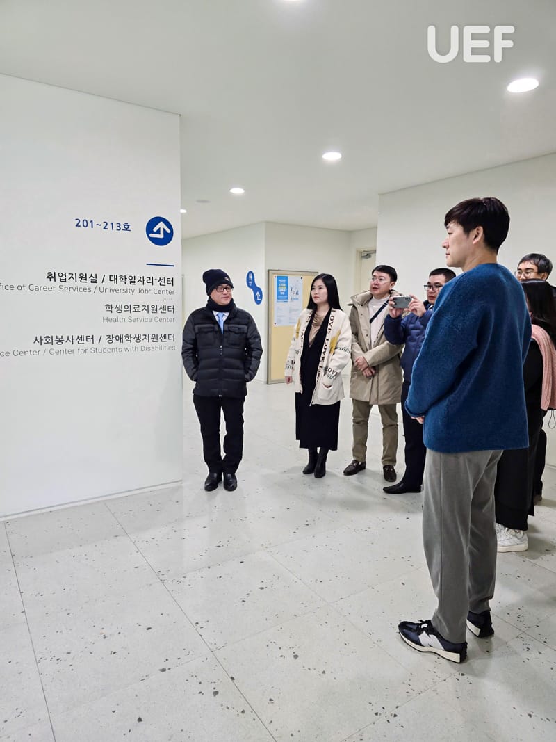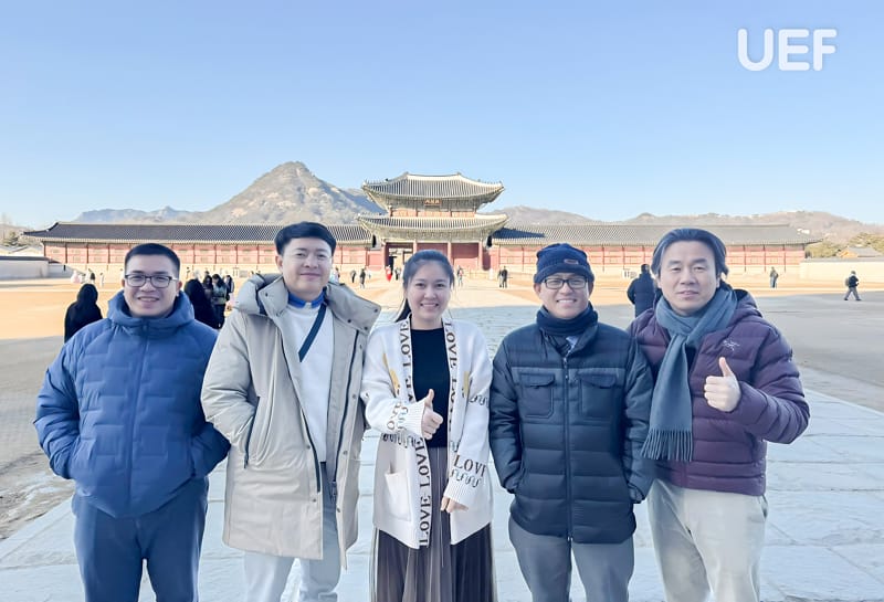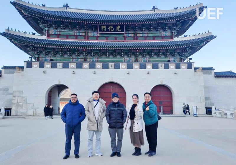 Đoàn lãnh đạo UEF công tác tại Hàn Quốc có TS. Nhan Cẩm Trí - Phó Hiệu trưởng, ThS. Bùi Quang Đông - Trưởng phòng Công tác sinh viên, ThS. Nguyễn Văn Mạnh - Phó Chánh Văn phòng trường, ThS. Phạm Thị Thùy Linh - Phó Trưởng khoa Ngôn ngữ và Văn hóa quốc tế, ThS. Nguyễn Thái Hà - Phó Giám đốc Trung tâm Hợp tác doanh nghiệp. Đại diện MNU đón tiếp, làm việc với đoàn có TS. Song Ha Cheol - Hiệu trưởng.