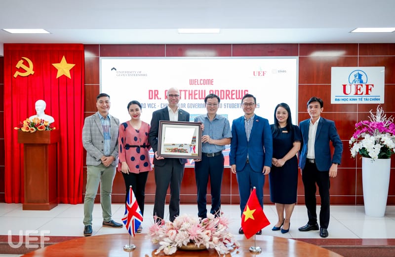 Đón tiếp TS. Matthew Andrews - Pro Vice - Chancellor Governance and Student Affairs UoG, đại diện UEF có: PGS.TS. Bùi Xuân Lâm - Phó Chủ tịch Hội đồng trường; TS. Đỗ Hữu Nguyên Lộc - Phó Hiệu trưởng, Viện trưởng Viện Quốc tế; TS. Ngô Minh Hải - Phó Hiệu trưởng Nhà trường; TS. Nguyễn Hồng Nhung, ThS. Trần Phương Quỳnh, ThS. Nguyễn Bá Anh - Phó Viện trưởng Viện Quốc tế.