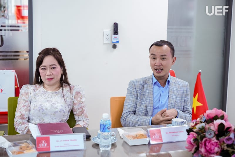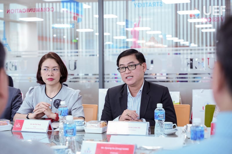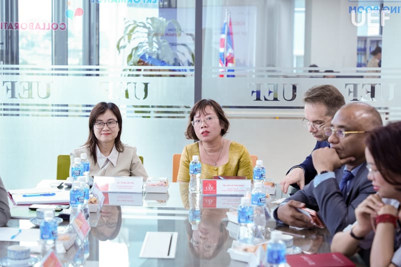 Trong phần trao đổi mở đầu, TS. Nhan Cẩm Trí giới thiệu tổng quan về UEF, đặc biệt là chương trình thực tập quốc tế, môi trường học tập song ngữ và các hoạt động quốc tế mà sinh viên UEF đã và đang được tham gia. Lãnh đạo hai trường ghi nhận những thành quả đạt được trong các chương trình hợp tác trước đây, đồng thời thống nhất mở rộng quan hệ ở nhiều lĩnh vực chiến lược.