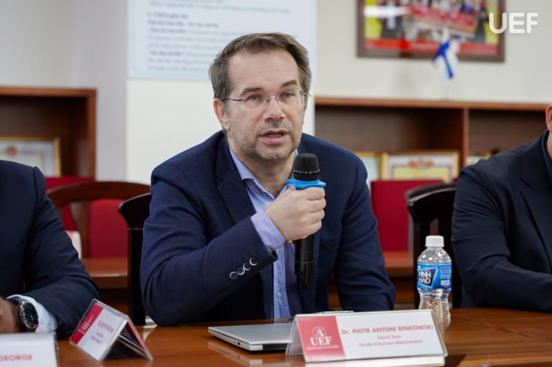 Đại diện UEF tham dự có TS. Đỗ Hữu Nguyên Lộc - Phó Hiệu trưởng, GS.TS. Eric Jose Olmedo Panal - Viện trưởng Viện Quốc tế, TS. Majo Geogre - Trưởng khoa Kinh tế, TS. Đỗ Thị Thu Hà - Phó Trưởng khoa Kinh tế, TS. Piotr Antoni Binkowski - Phó Trưởng khoa Quản trị kinh doanh, ThS. Nguyễn Thanh Lâm - Phó Trưởng khoa Tài chính - Kế toán, TS. Nguyễn Kim Thoa - Phó Viện trưởng Viện Quốc tế, ThS. Hoàng Trần Quang Dương - Tổ trưởng Tổ Đào tạo quốc tế.