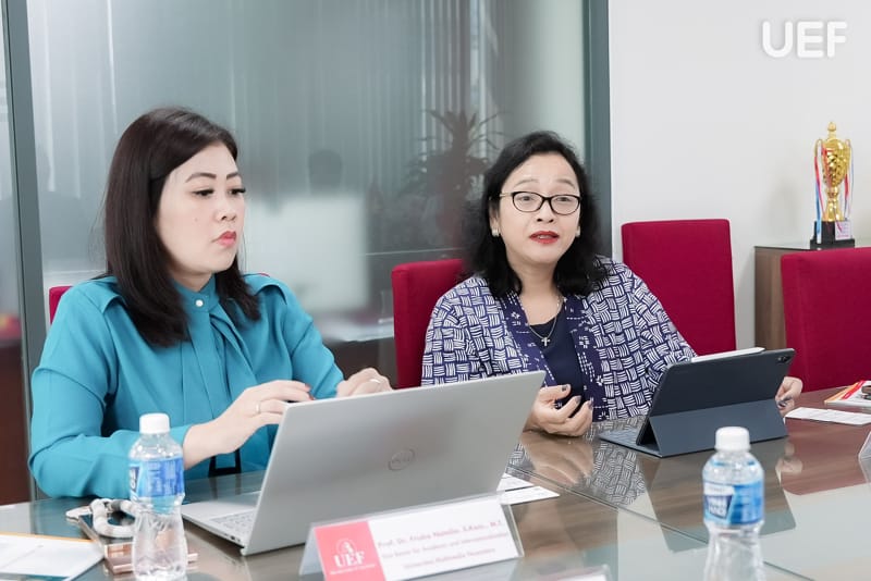 Tham dự buổi làm việc, đại diện UEF có TS. Đỗ Hữu Nguyên Lộc - Phó Hiệu trưởng, GS.TS. Eric Jose Olmedo Parra - Viện trưởng Viện Quốc tế, TS. Nguyễn Kim Thoa - Phó Viện trưởng Viện Quốc tế. Về phía UMN có Prof. Dr. Florentina Kurniasari T., S.Sos., M.B.A - Vice Rector for Research, Innovation and Sustainability và Prof. Dr. Friska Natalia, S.Kom., M.T. - Vice Rector for Academic and Internationalization.