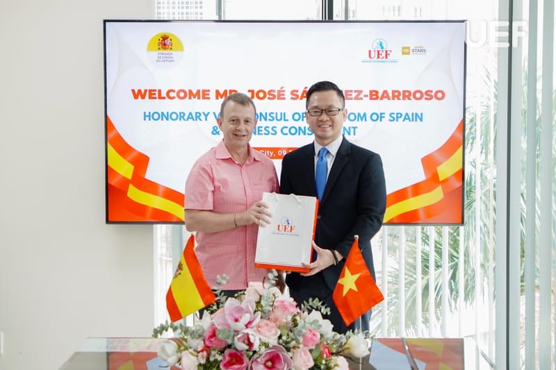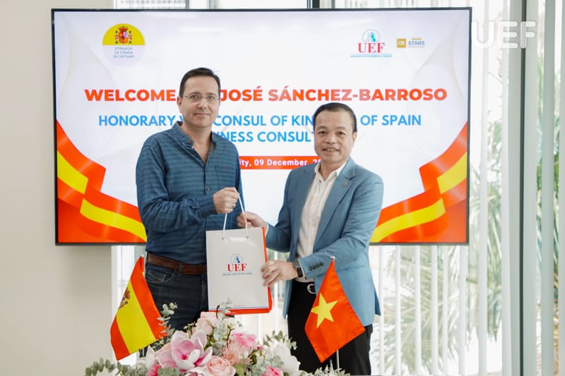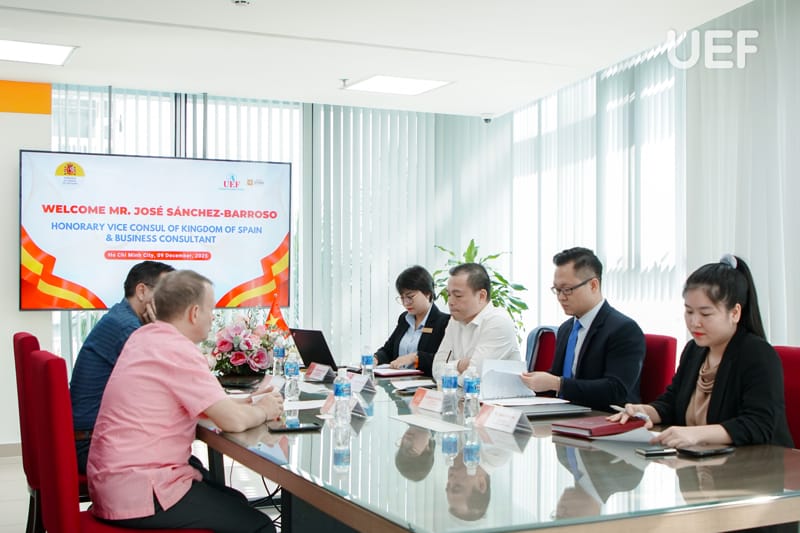 Sáng ngày 9/12, UEF đã có buổi làm việc với ông José Sánchez-Barroso - Phó Lãnh sự danh dự Tây Ban Nha và ông Jorge Martín Martínez - Giám đốc điều hành BullMConsulting, nhằm thảo luận các cơ hội mở rộng hợp tác học thuật, liên kết đào tạo và trao đổi sinh viên giữa UEF và các trường đại học châu Âu, đặc biệt là Tây Ban Nha.