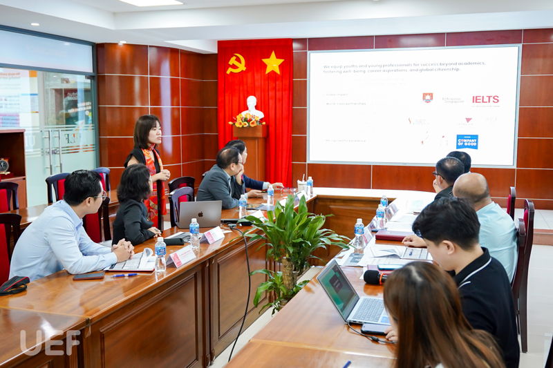 Đại diện UEF đón tiếp và làm việc với đoàn có TS. Nhan Cẩm Trí - Phó Hiệu trưởng Nhà trường, TS. Mạch Trần Huy - Phó Chánh Văn phòng trường và ThS. Huỳnh Quốc Phong - Giám đốc Trung tâm Hợp tác doanh nghiệp.