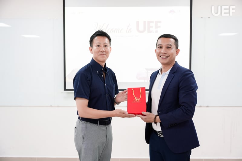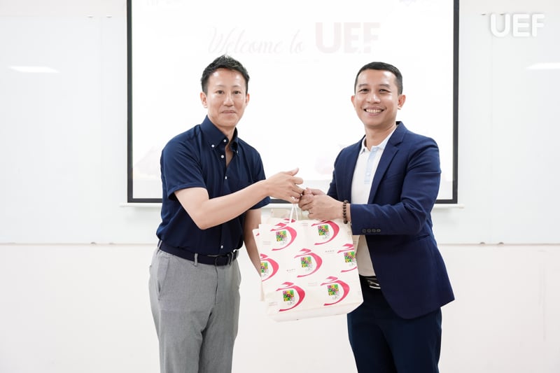 Đại diện UEF tiếp đón đoàn khách quốc tế có thầy Võ Văn Thành Thân - Giám đốc Trung tâm Phát triển nguồn nhân lực Việt Nhật, Phó Trưởng khoa Ngôn ngữ và Văn hóa quốc tế; ThS. Hoàng Vũ Đức - Giảng viên ngành Ngôn ngữ Nhật. Về phía đoàn khách quốc tế có thầy Goto Matsutaro và cô Matsushita Chinami cùng các bạn sinh viên Nhật Bản.