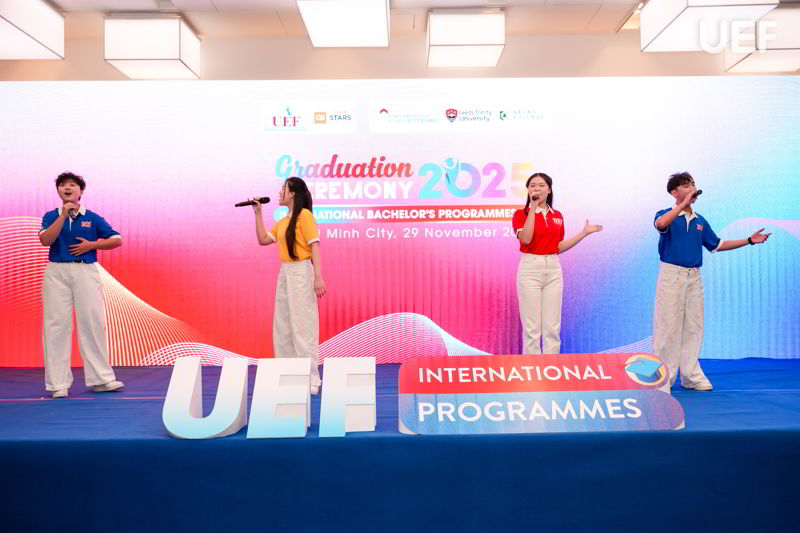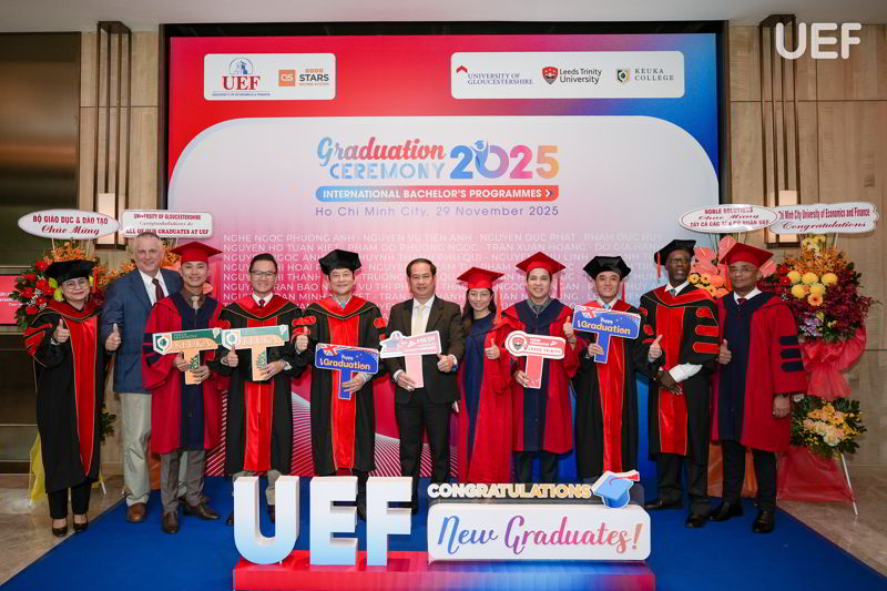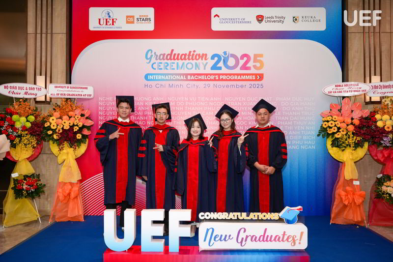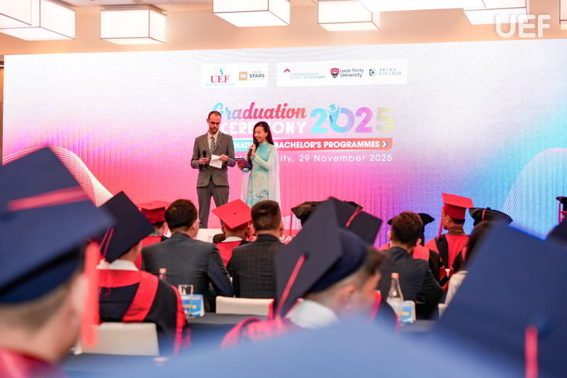 Sáng ngày 29/11, tại khách sạn New World Saigon, UEF đã long trọng tổ chức Lễ Bế giảng và trao bằng tốt nghiệp Cử nhân liên kết quốc tế năm 2025 dành cho sinh viên khóa 2021 thuộc ba chương trình hợp tác với Đại học Gloucestershire (Anh Quốc), Đại học Leeds Trinity (Anh Quốc) và Đại học Keuka (Hoa Kỳ). Buổi lễ chính thức khép lại hành trình học tập chuẩn quốc tế kéo dài bốn năm, đồng thời đánh dấu bước chuyển quan trọng để các tân cử nhân tự tin bước vào môi trường làm việc toàn cầu.