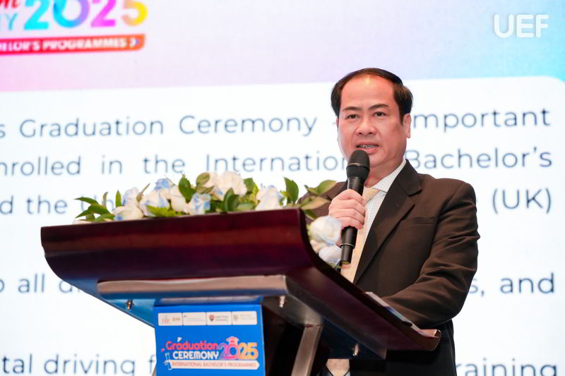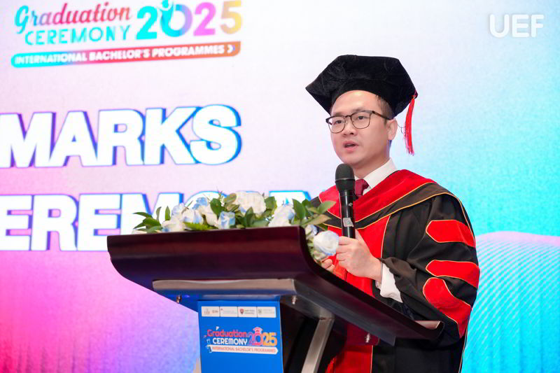 Phát biểu khai mạc buổi lễ, TS. Đỗ Hữu Nguyên Lộc - Phó Hiệu trưởng UEF ghi nhận nỗ lực của sinh viên trong toàn bộ quá trình học tập, từ nền tảng học thuật chuẩn quốc tế đến các trải nghiệm thực tiễn thông qua hệ sinh thái đào tạo đa văn hóa. Theo thầy, mỗi bằng cử nhân quốc tế vừa thể hiện thành quả học thuật, vừa là hành trang hội nhập, mở ra cơ hội phát triển mạnh mẽ cho sinh viên trên thị trường lao động toàn cầu.