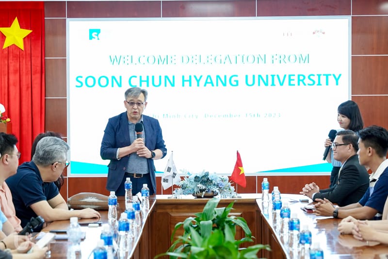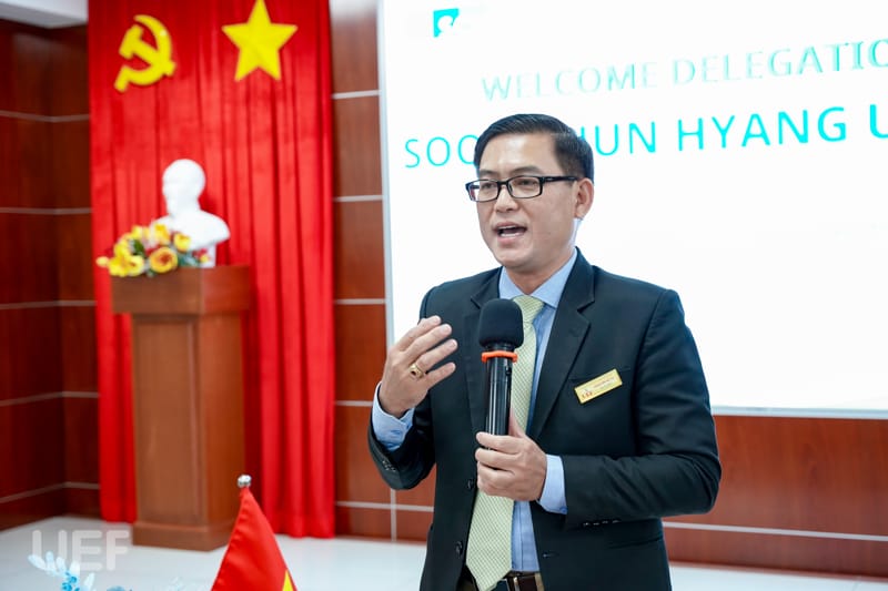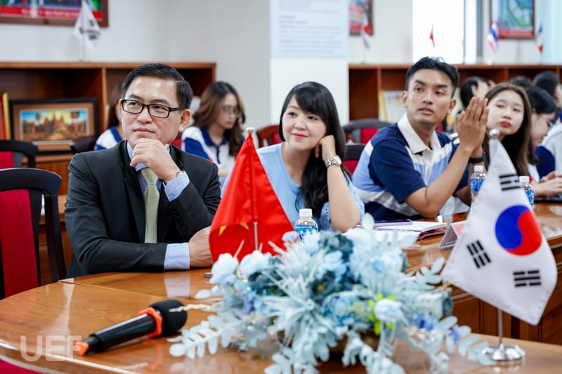 Phát biểu chào mừng đoàn đối tác, TS. Nhan Cẩm Trí nhấn mạnh giá trị của hoạt động giao lưu, trao đổi ngôn ngữ và văn hóa, điều này góp phần thúc đẩy sự gắn kết giữa hai bên, cũng như tạo môi trường để sinh viên phát triển. Đồng thời, thầy cũng giới thiệu thông tin nổi bật về UEF đến các giáo sư và sinh viên Hàn Quốc.