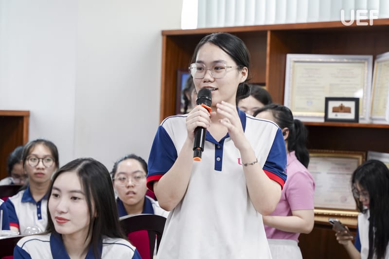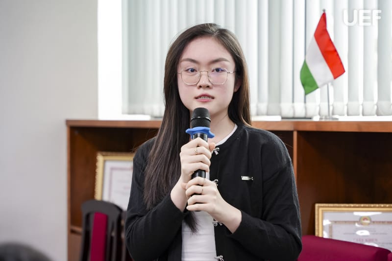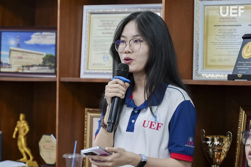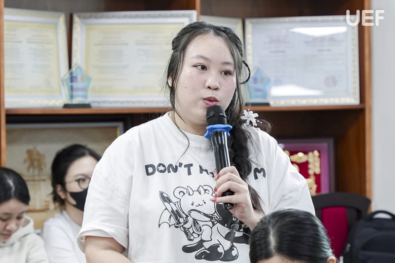 Bên cạnh phần giao lưu chuyên môn, sinh viên UEF còn chủ động tham gia thuyết trình giới thiệu doanh nghiệp, đặt câu hỏi trực tiếp cho các khách mời và lắng nghe tư vấn về CV, điều kiện tuyển dụng, cơ hội thực tập, đào tạo và phát triển nghề nghiệp. Không khí trao đổi cởi mở, song ngữ Việt - Trung đã giúp chương trình trở thành diễn đàn học tập và kết nối hiệu quả.