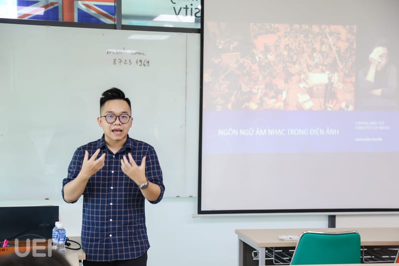 Nằm trong khuôn khổ môn học Music Appreciation, vào ngày 13/6, Viện Quốc tế UEF đã tổ chức workshop “In the Act of Sound” dành cho sinh viên của chương trình Cử nhân quốc tế, Đại học Keuka. Với chủ đề “Ngôn ngữ âm nhạc trong điện ảnh”, diễn giả đã đưa các bạn sinh viên đến với thế giới của nghệ thuật phim ảnh và cùng “bóc tách” những bí quyết làm nên thành công của một tác phẩm về mặt âm thanh.