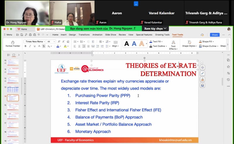 Trong buổi học thứ ba của chuỗi khóa học trực tuyến Kinh tế - Tài chính, học viên cao học Christ University (Ấn Độ) và sinh viên UEF tiếp tục được dẫn dắt bởi TS. Nguyễn Thị Cúc Hồng - Giảng viên Khoa Kinh tế UEF với chủ đề FX Determination (Cơ chế xác định tỷ giá hối đoái). Buổi học mang đến góc nhìn toàn diện về cách thức vận động của thị trường ngoại hối, các mô hình lý thuyết giải thích biến động tỷ giá và ứng dụng thực tiễn trong phân tích kinh tế quốc tế.