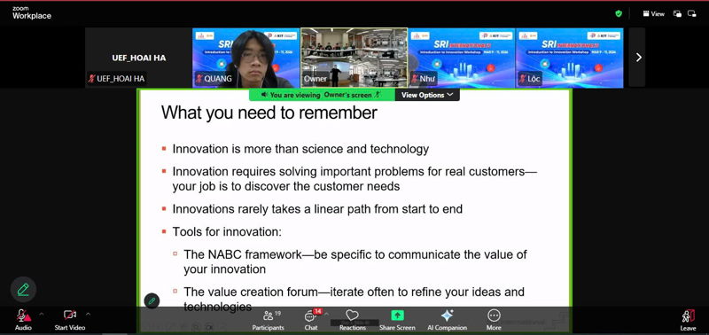 Sau ba ngày học tập liên tục từ 9 đến 11/3, lớp đồng giảng trực tuyến với chủ đề “SRI’s Introduction to Innovation” đã chính thức khép lại với nhiều dấu ấn học thuật và sáng tạo.