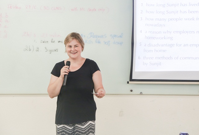 Tại lớp học, sinh viên hai trường đã tiến hành chia nhóm và thực hành kỹ năng nói tiếng Anh. Với vốn kiến thức đã được trang bị, sinh viên UEF tự tin trao đổi, thảo luận cùng những người bạn quốc tế.