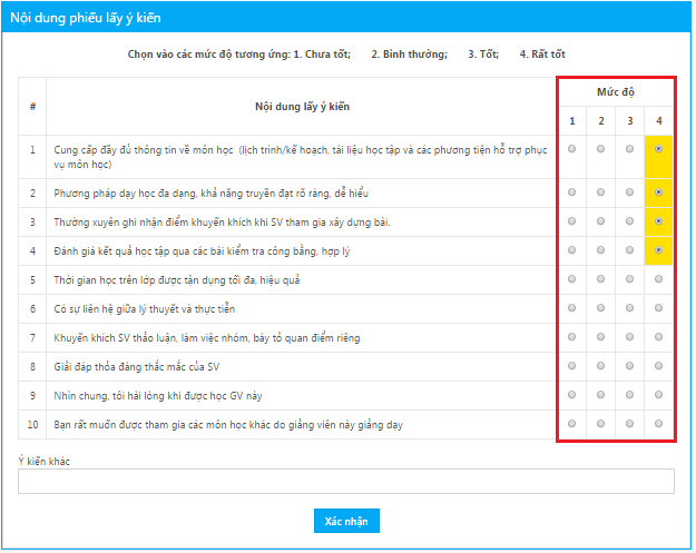 Bước 5: Tại nội dung phiếu lấy ý kiến, chọn các mức độ 1, 2, 3, 4 tương ứng với các mức: