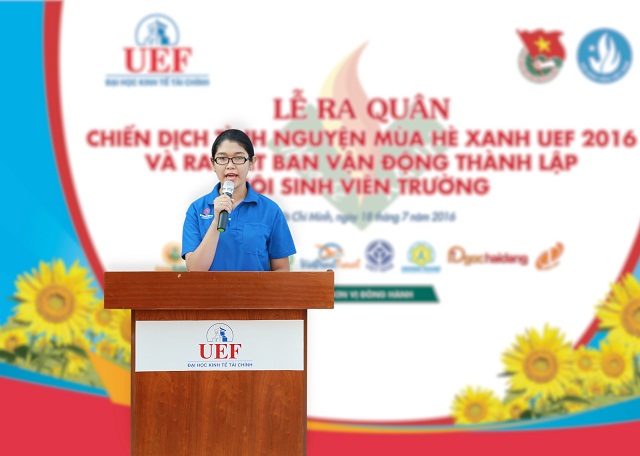 Thay mặt cho toàn thể chiến sĩ MHX UEF, bạn Nguyễn Ngọc Bảo Trâm đã phát biểu cảm nghĩ trước giờ xuất quân: “Cuộc sống đẹp biết bao khi chúng ta mang nhiệt huyết tuổi trẻ để cống hiến, góp sức vì cộng đồng. Hành trình sống đẹp, sống có ích của thanh niên không bao giờ dừng lại, bởi nó là hành trình bất tận trong trái tim của mỗi con người. Chúng ta hãy sống những ngày đẹp nhất, làm những công việc bình dị nhưng ý nghĩa nhất với tất cả nhiệt huyết và tình yêu của mình để MHX 2016 mãi là một dấu chân tình nguyện đáng nhớ trên những nẻo đường của Tổ quốc...”
