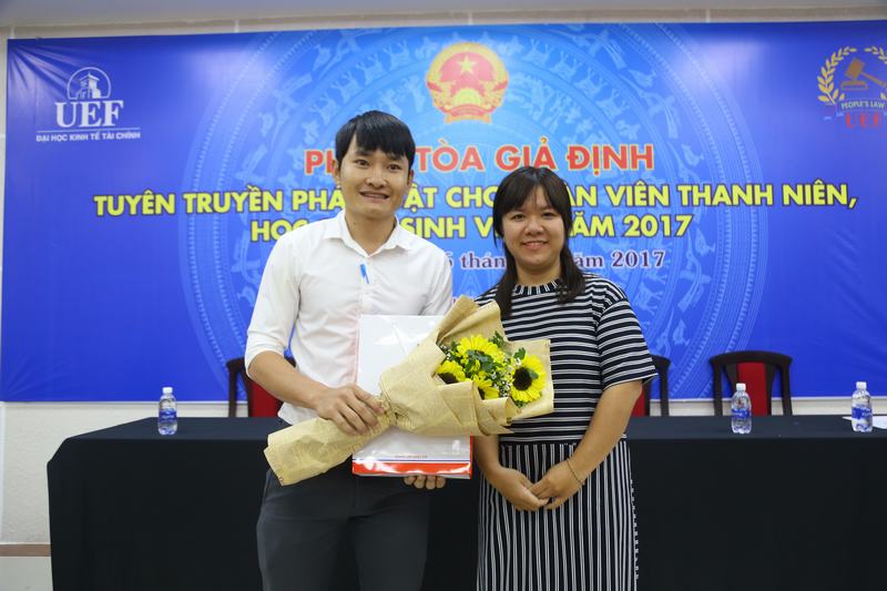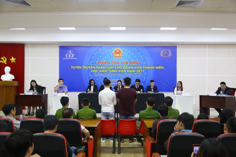 Phiên toà giả định tại UEF vinh dự đón tiếp ông Nguyễn Sĩ Diệu – đại diện viện kiểm sát tỉnh Long An, bà Võ Thị Thu Hương – đại diện phòng tuyên truyền phòng chóng mại dâm buôn bán người, về phía Nhà trường có sự tham dự của thầy Ngô Cao Cường – Phó hiệu trưởng Nhà trường, các thầy cô Khoa Luật – Quan hệ quốc tế, đại diện BCH Đoàn trường. Mặc dù là lần đầu tiên tổ chức nhưng phiên toà giả định đã nhận được sự quan tâm của đông đảo sinh viên toàn trường. Đây cũng là kết quả của hơn hai tháng chuẩn bị kĩ lưỡng, luyện tập công phu cũng như cố gắng của các bạn sinh viên khoa Luật và ban tổ chức.