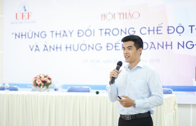 Chiều ngày 26/12, đông đảo sinh viên Trường Đại học Kinh tế - Tài chính thành phố Hồ Chí Minh (UEF) đã có dịp cập nhật những thay đổi mới nhất về chính sách thuế trong năm 2015 đồng thời trang bị thêm vốn kiến thức thực tiễn bổ ích thông qua buổi Hội thảo chuyên đề mang tính thời sự “Những thay đổi trong chế độ thuế 2015 và ảnh hưởng đến doanh nghiệp” do Khoa Tài chính – Kế toán tổ chức.