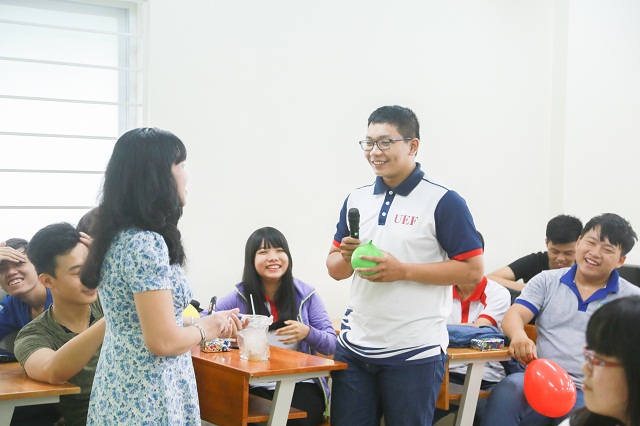 Mở đầu chương trình, Thạc sỹ Tâm lý Phùng Duy Hoàng Yến đã khéo léo dẫn dắt các bạn sinh viên tiếp cận vấn đề “cho và nhận” trong tình yêu thời sinh viên bằng những trò chơi vận động vui tươi, thú vị.