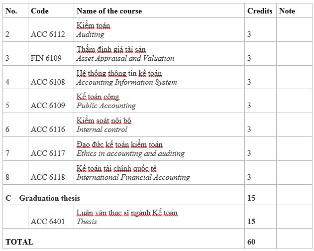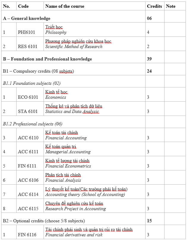 The Master of Accounting program is suitable for all people graduated from the university with the accounting major or related majors. Those who have graduated from other majors can enroll extra courses to be able to enroll to this program.