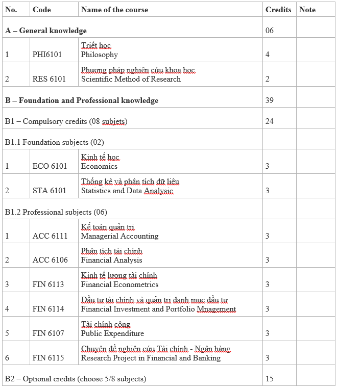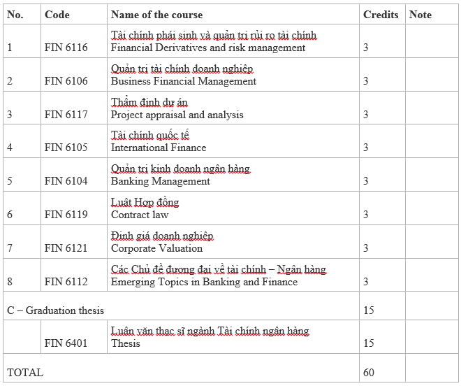 The program of Master of Finance – banking is suitable for all university graduates with the same major or related major such as: Business Administration, Accounting – Auditing, Economic management… Graduates from other majors can attend extra courses to transfer their credit to be able to enroll in the Master of Finance – banking.