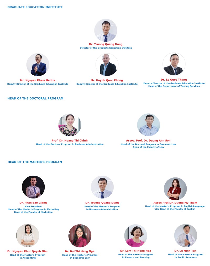 The Graduate Education Institute is committed to delivering high-quality master’s and doctoral programmes that integrate theory, practice, and scientific research; developing a cohort of experts, managers, and researchers with strong professional competence, critical thinking, and ethical integrity; and contributing to the sustainable development of enterprises, society, and the knowledge-based economy.