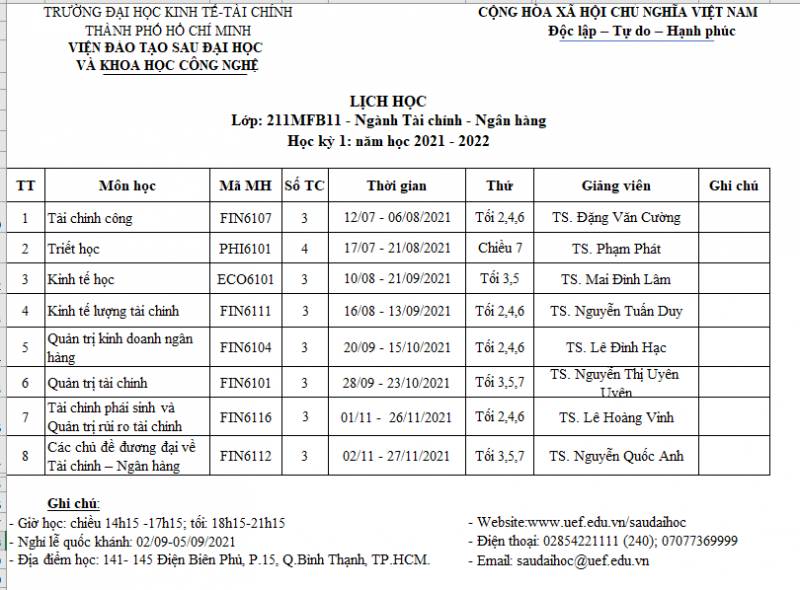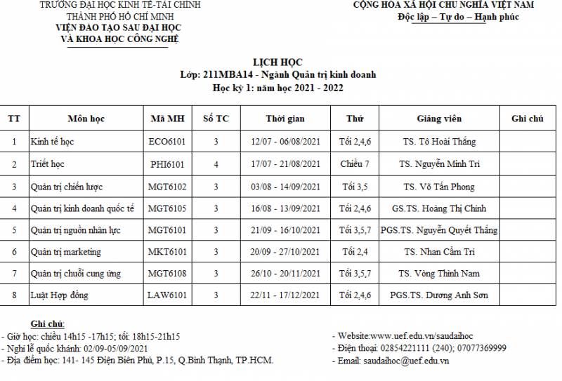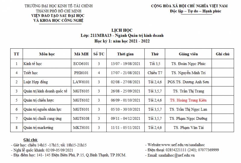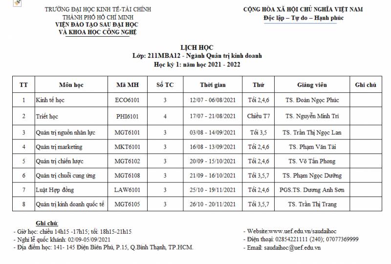 Schedule for Semester 2 of class 182MBA11 in the school year 2018 - 2019