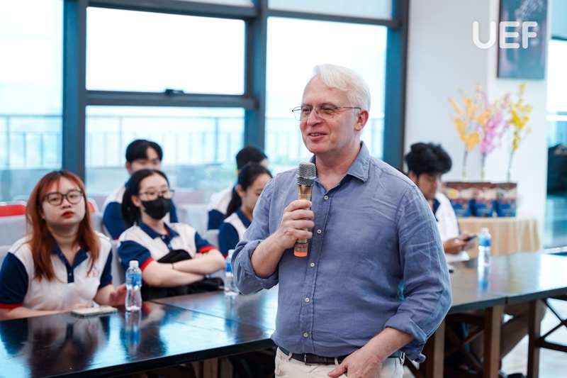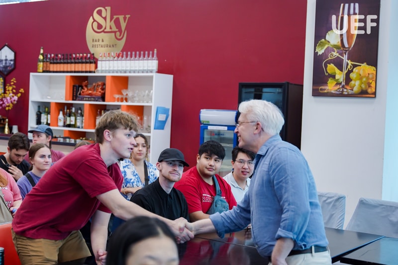 At the workshop, students had the opportunity to listen to shared insights from Prof.Dr. Eric Jose Olmedo Panal - Director of the UEF International Institute, Dean of Faculty of Tourism and Hospitality Management, and Ms. Thao Quynh - Founder & Owner of the Lala Coffee & Tea chain. On behalf of UEF and the Faculty of Tourism and Hospitality Management were Dr. Do Nguyen Huu Loc - Vice President, Ms. Nguyen Viet Thuy - Deputy Dean of the Faculty of Tourism and Hospitality Management, Ms. Nguyen Thi Lan Chi - Dean of the Faculty of Hospitality Management, and Ms. Tran Thị Bich Duyen - Lecturer. The event also welcomed partners, including Mr. Kevin Thacker - Consultant của M&K Tourism and Culture Exchange with Ms. Thanh Tram - Barista Expert of the University of Arkansas.