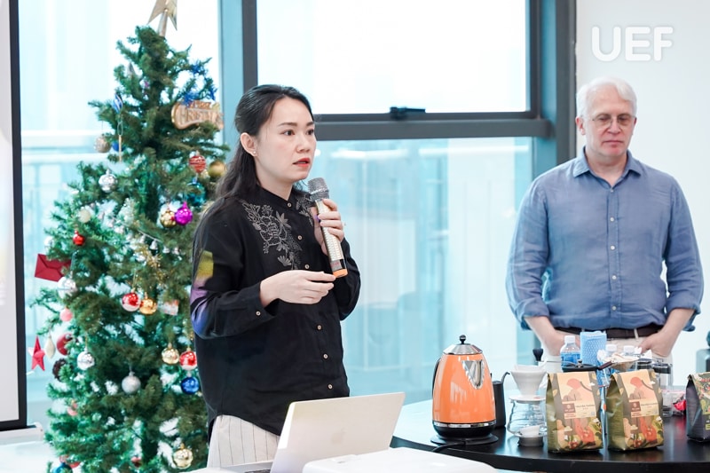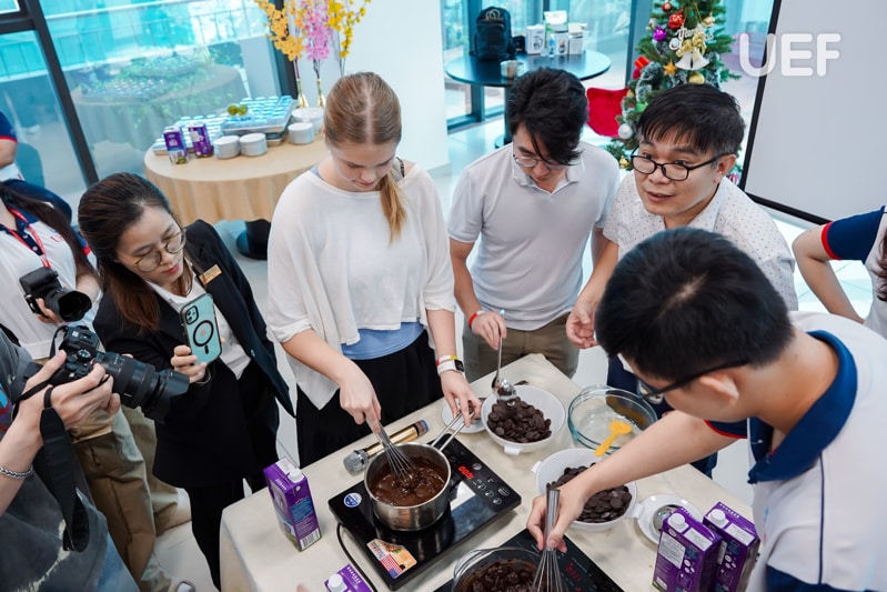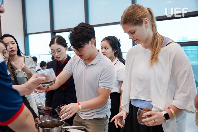 DECEMBER 20, the UEF International Institute welcomed the University of Arkansas (USA) to participate in a special workshop titled FTHM.TALK: Gourmet Journeys: Coffee, Chocolate, Cuisine & Culture, organized by the Faculty of Tourism and Hospitality Management. By participating in the workshop, students of both universities explored the connection between beverages and different cultures. They also experienced the brewing process of and sampled the distinctive flavors of coffee and chocolate.