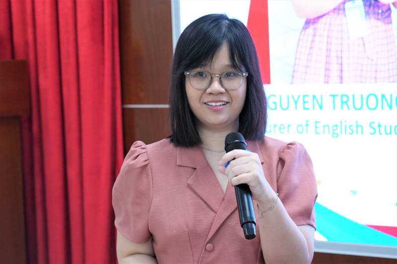Ms. Nguyen Tuong Gia Minh, a UEF alumnus and currently a lecturer at HUFLIT, shared an inspiring story from her personal experience. She affirmed that scientific research not only helps students discover themselves but also cultivates critical thinking and problem-solving skills. Additionally, she encouraged young people to boldly step beyond their limits to reach the pinnacle of knowledge.